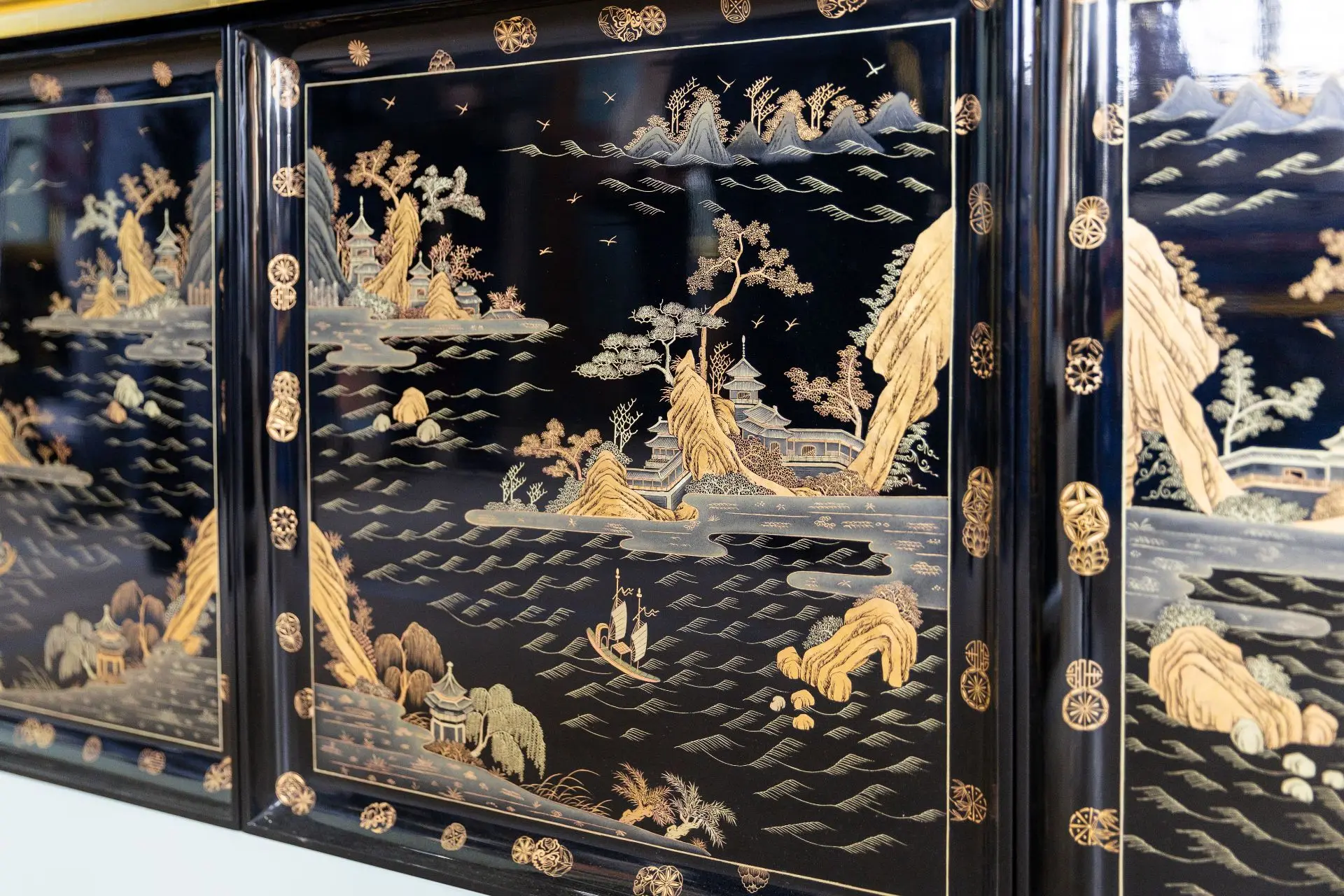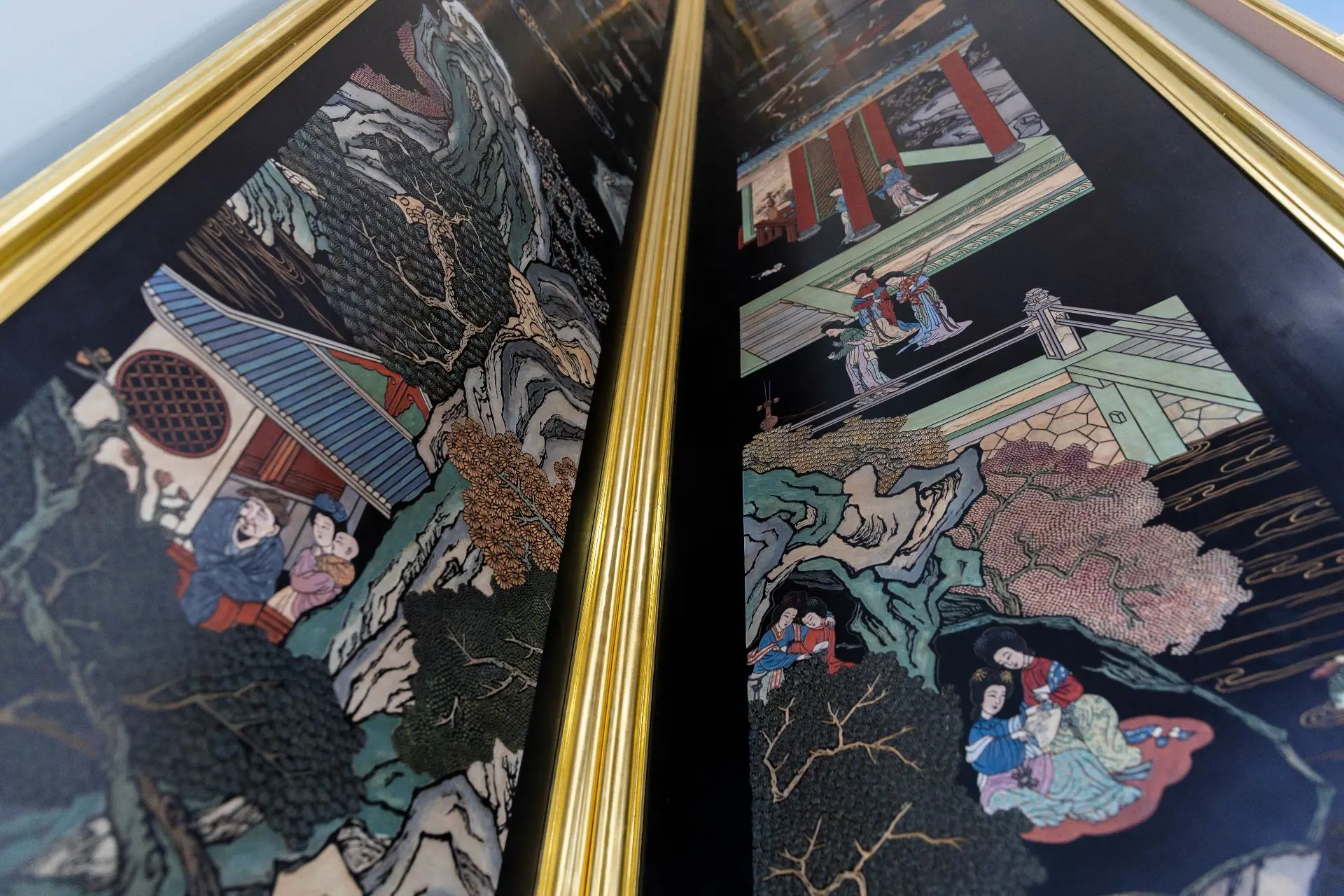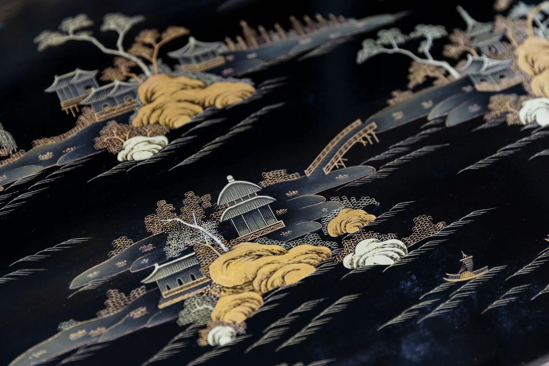 – верхний ярус: большие панно в технике мяоцзинь (золотым лаком по чёрному лаку)