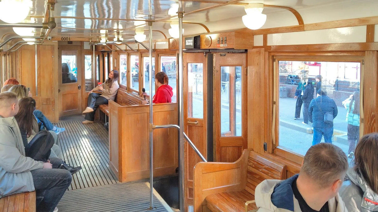 Трамвайчик «Американка» не спутать ни с каким другим — ярко-красный, в его внешней и внутренней отделке преобладает дерево. Старомодный салон полностью облицован деревом, и даже деревянные скамейки-сиденья, ручки у дверей, механизм