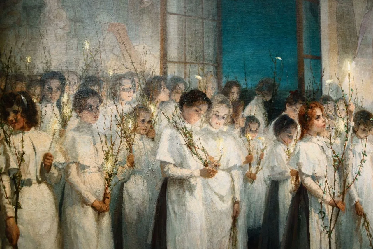 Выбирая сюжет для картины, художница остановилась на трогательной сцене: юные гимназистки изображены в храме в праздничных форменных платьях с ветками вербы и свечами в руках, их фигуры и лица стали олицетворением внутренней чистоты и света.