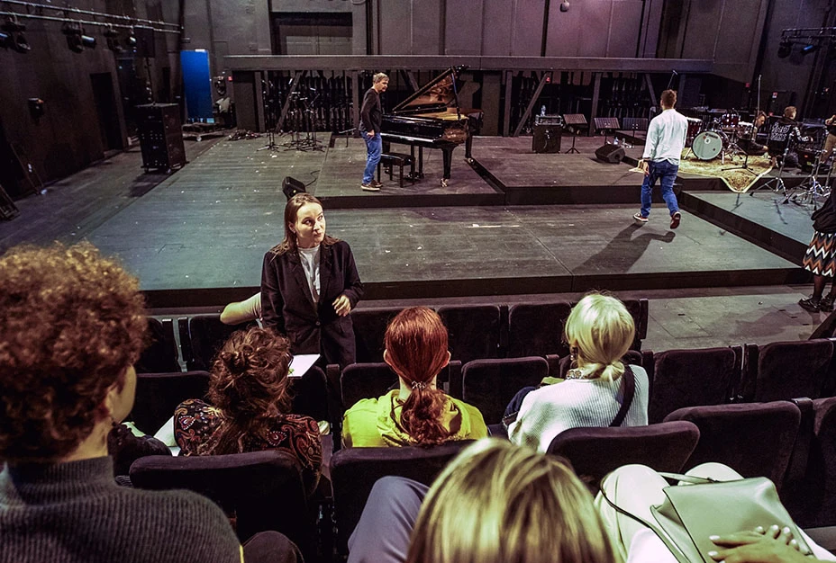 На встрече вы узнаете, как работает сцена-трансформер, почему сохранили стену склада декораций, посмотрите на памятник Мейерхольду из окна гримёрки и разберётесь в том, как театр сегодня использует современные технологии.