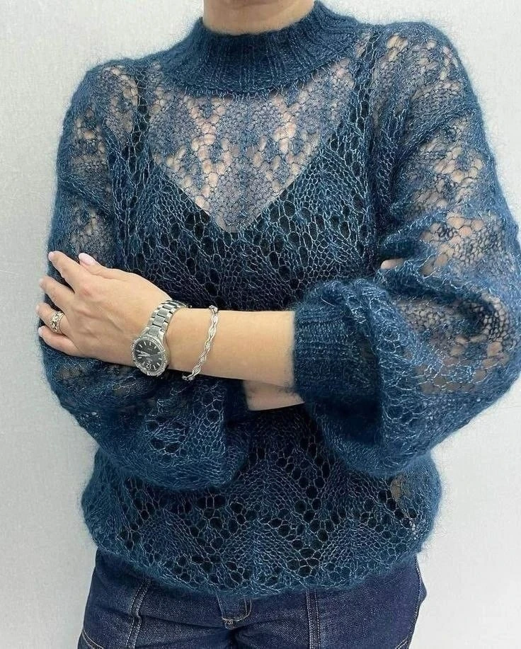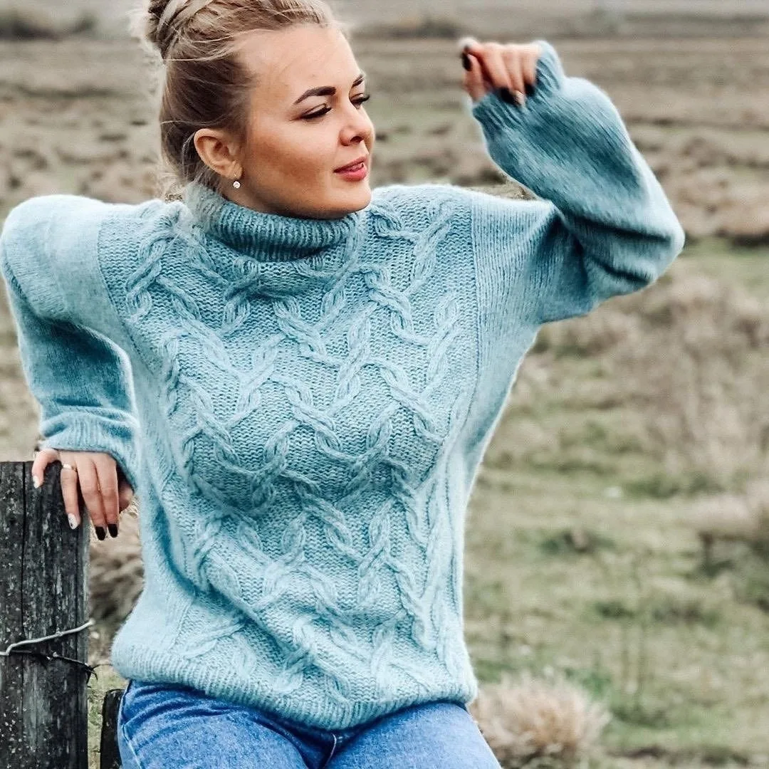 Модель оверсайз, реглан, воротник - широкая стойка, свитер связан вкруговую снизу вверх.