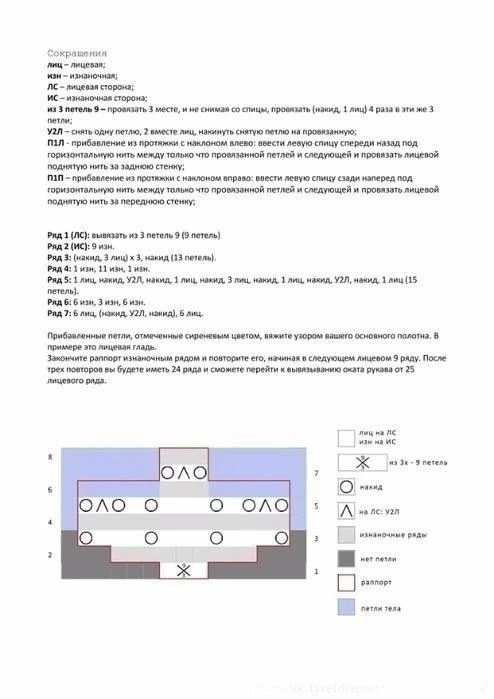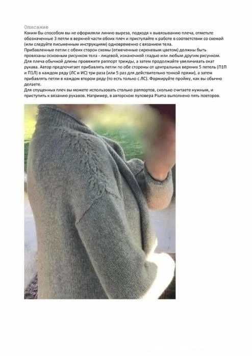На уровне пройм я соединяла полотно туловища и рукава, оформляла подрезы и, вывязывая регланные линии "поднималась" до начала условного выреза горловины. С каждой стороны регланных линий я вязала по три петли вместе в каждом 4-м (лицевом) ряду - 1 лиц, 1 изн., 1 лиц.
