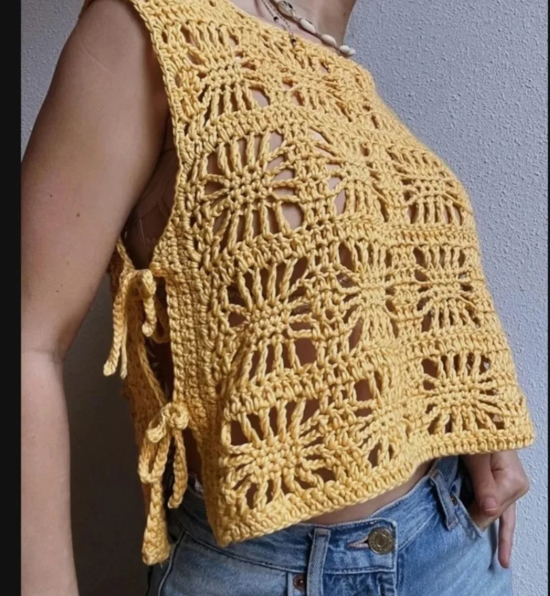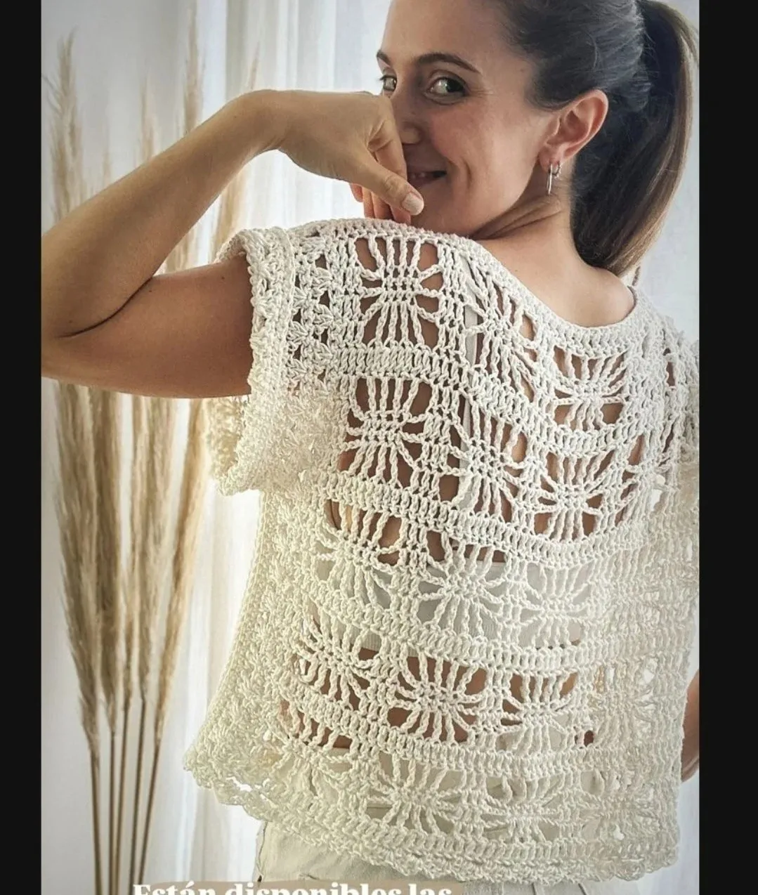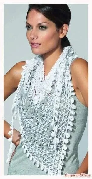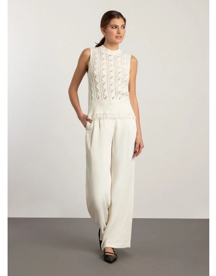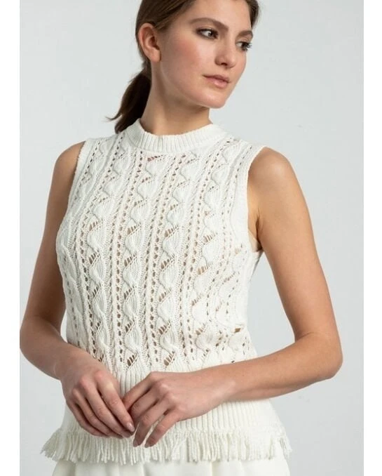 Стильный, белый топ с бахромой. Узор - сочетание ажурной дорожки и жгутов. Комбинация дырочек и жгутов популярна во все времена.