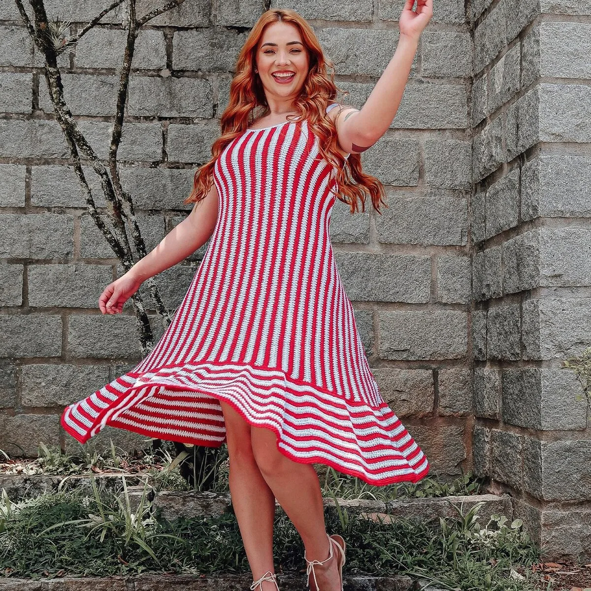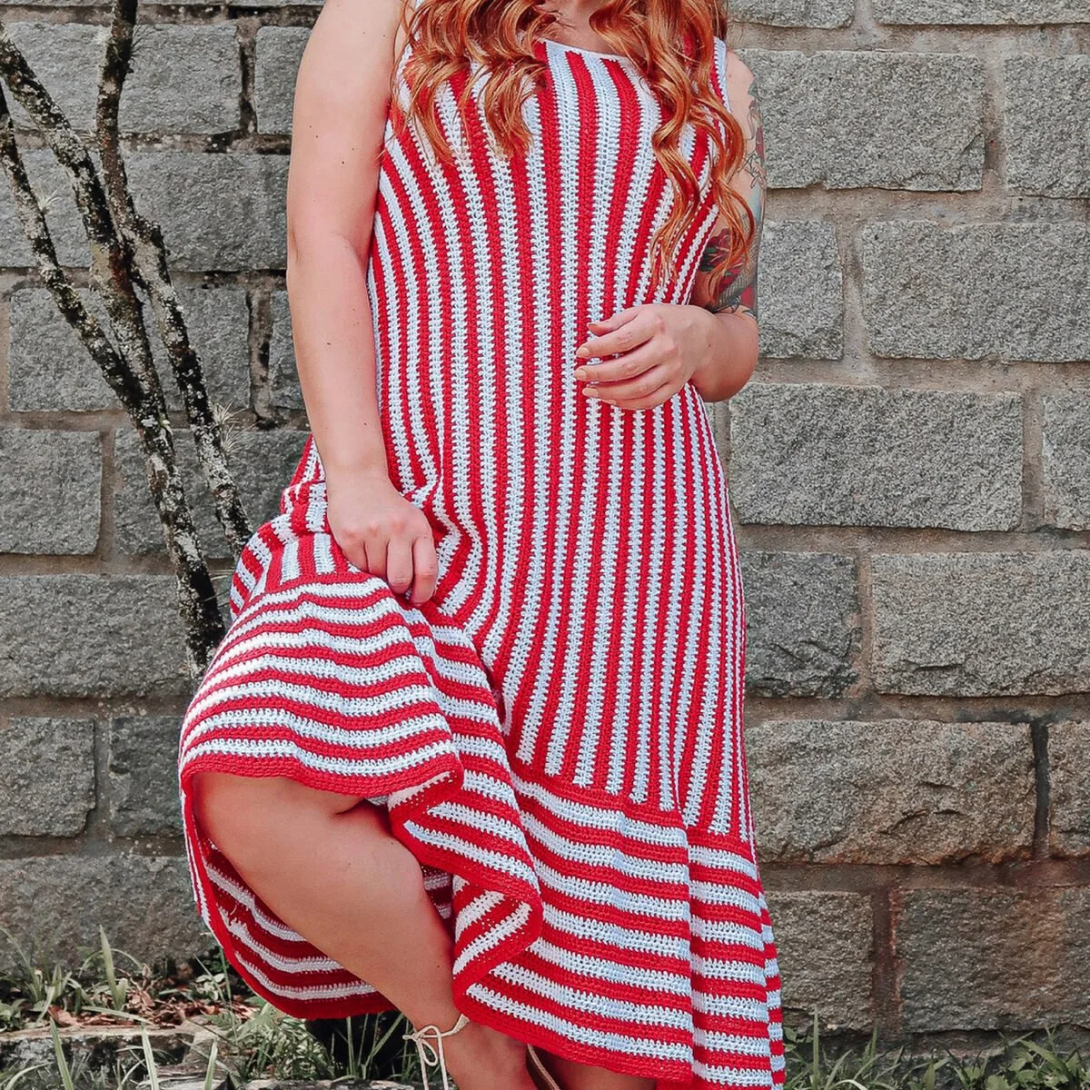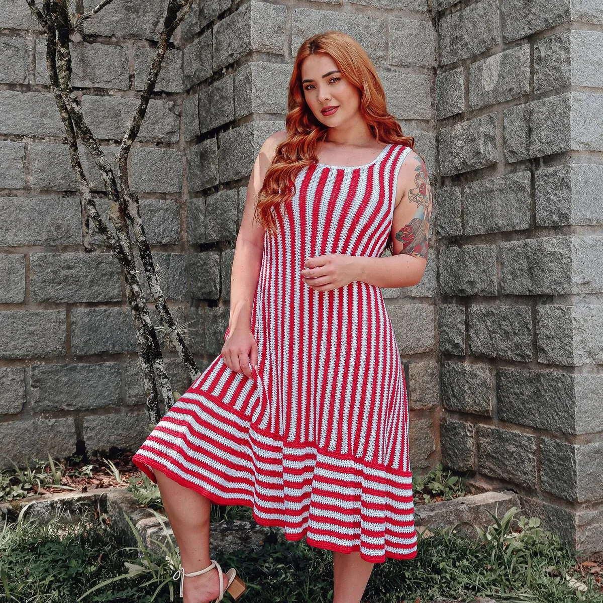 Очаровательный сарафан с классическим фасоном «колокол» в вертикальную красно-белую полоску. Мягкие рюши в горизонтальную полоску по низу.
