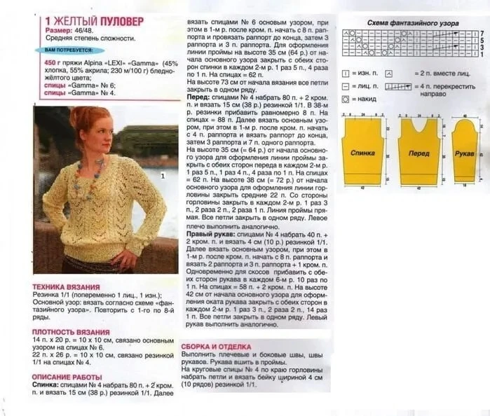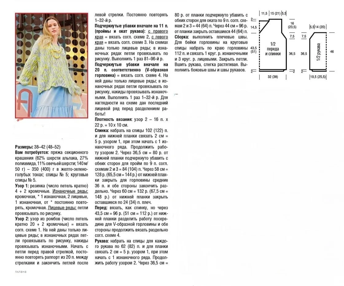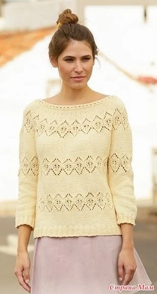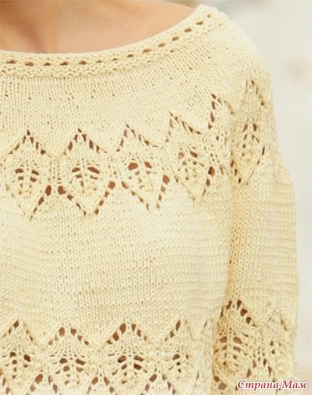 Вязание пуловера начинается от воротника по кругу, для формирования кокетки выполняются равномерные прибавки в петлях чулочной связки. Ажурный узор вяжется по приведенным в описании схемам.
