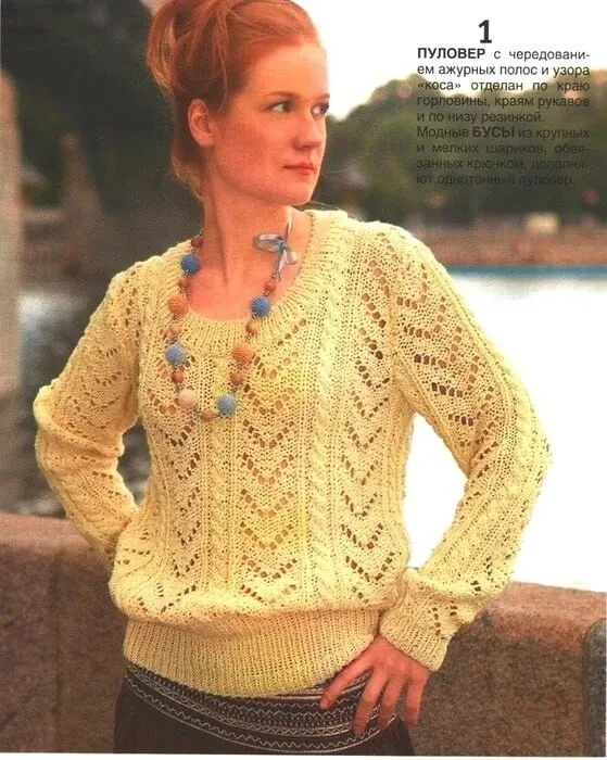Джемпер с ажурным узором, высоким воротом и высокими манжетами спицами