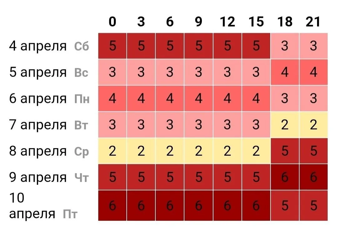 Согласно прогнозу, геошторм продлится с 5 по 11 апреля. В это время значения будут колебаться от слабых до сильных. Пик бури придется на следующий четверг.