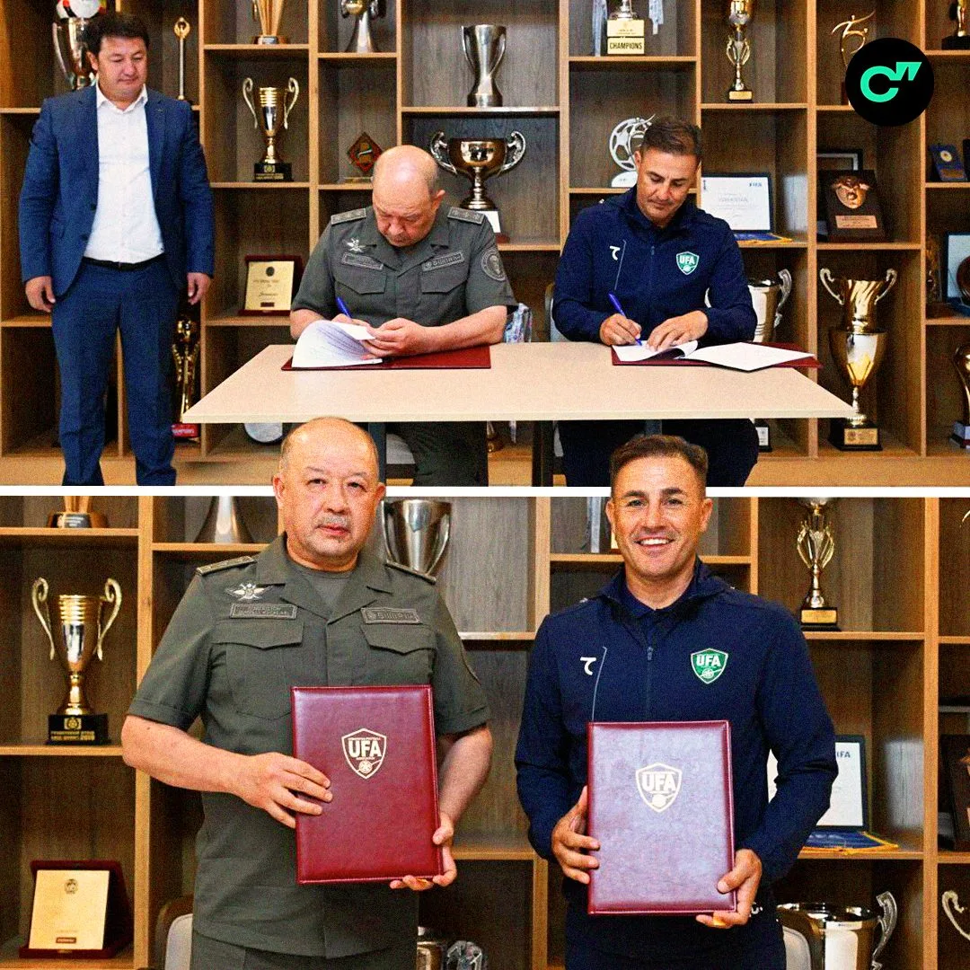 🇺🇿 🪖 Новый главный тренер сборной Узбекистана Фабио Каннаваро подписал контракт рядом с президентом Футбольной ассоциации Баходиром Курбановым − до 2024 года он занимал пост министра обороны Узбекистана