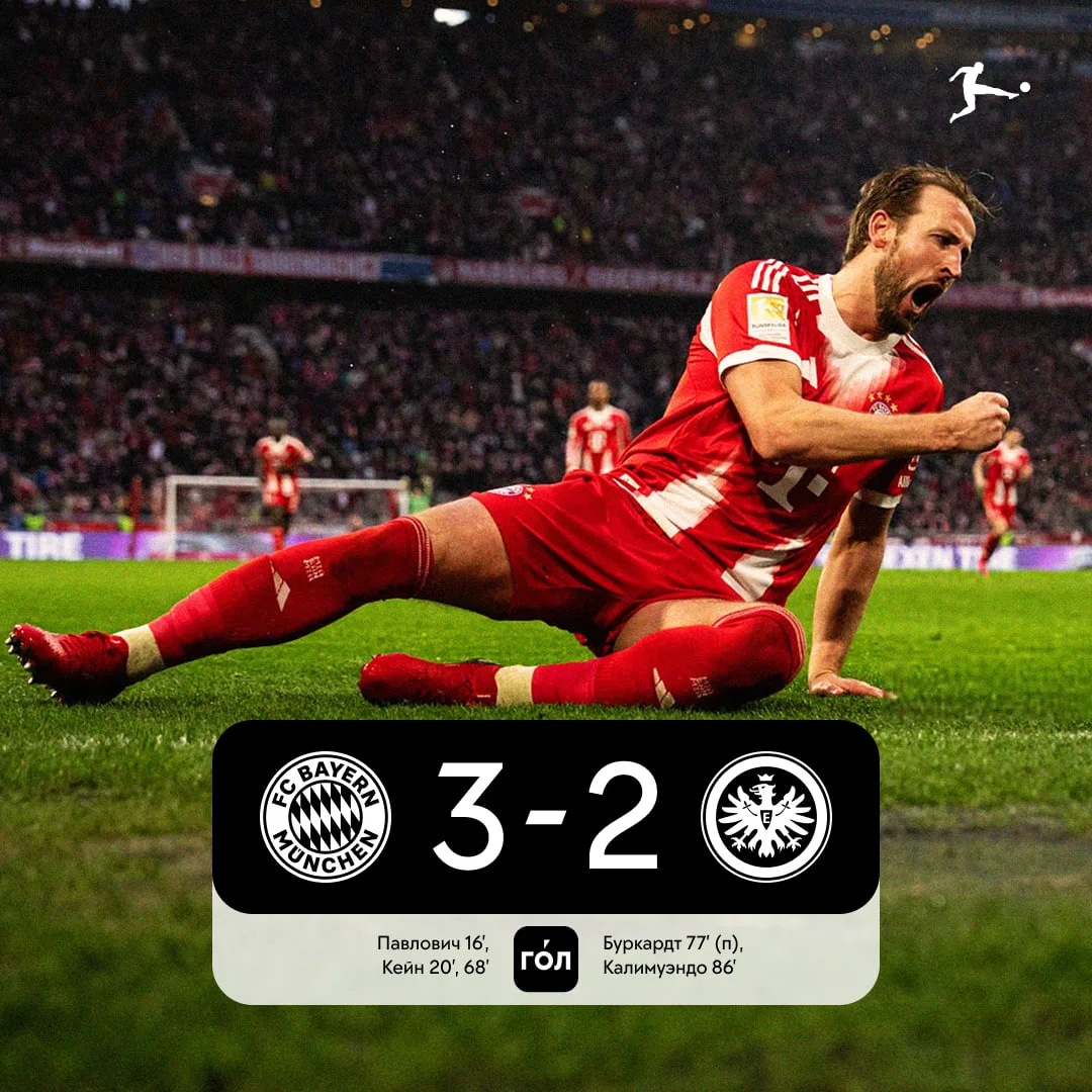 🇩🇪 Кейн выбил невероятные 48 голов в 41 игре сезона за «Баварию» и Англию – сегодня его дубль помог мюнхенцам обыграть «Айнтрахт»!