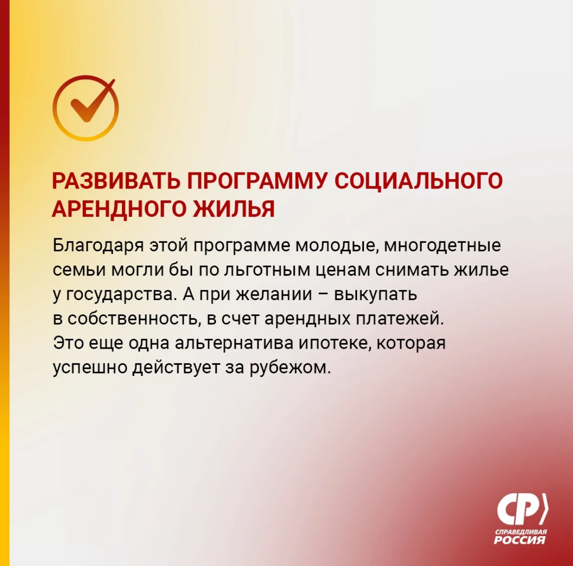☝ СПРАВЕДЛИВАЯ РОССИЯ предлагает запустить программу социального найма жилья, которое простаивает и приносит убытки застройщикам. Застройщики смогут сдавать такие квартиры в долгосрочную аренду государству, а государство будет передавать нуждающимся с возможностью выкупа при господдержке. Кроме того, необходимо запустить и другие механизмы решения жилищной проблемы в стране – строительные сберкассы и льготные ипотечные программы с погашением кредитов при рождении детей. Этот шаг необходим для выхода из демографического кризиса. На кону не квадратные метры, а вопрос государственной важности – вопрос будущего России!