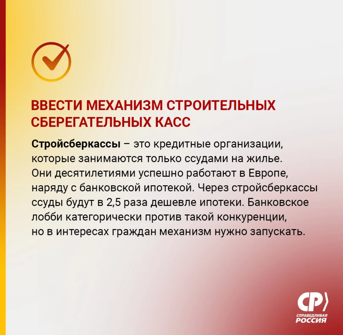 🏠 СПРАВЕДЛИВАЯ РОССИЯ много лет призывает Правительство, что не надо упираться в одну ипотеку. Нужны другие, конкурентные способы обеспечения граждан жильем. А при наличии альтернатив и банки будут делать ипотеку доступнее. В качестве альтернатив ипотеке мы предлагаем институт стройсберкасс и программу социальной аренды жилья.