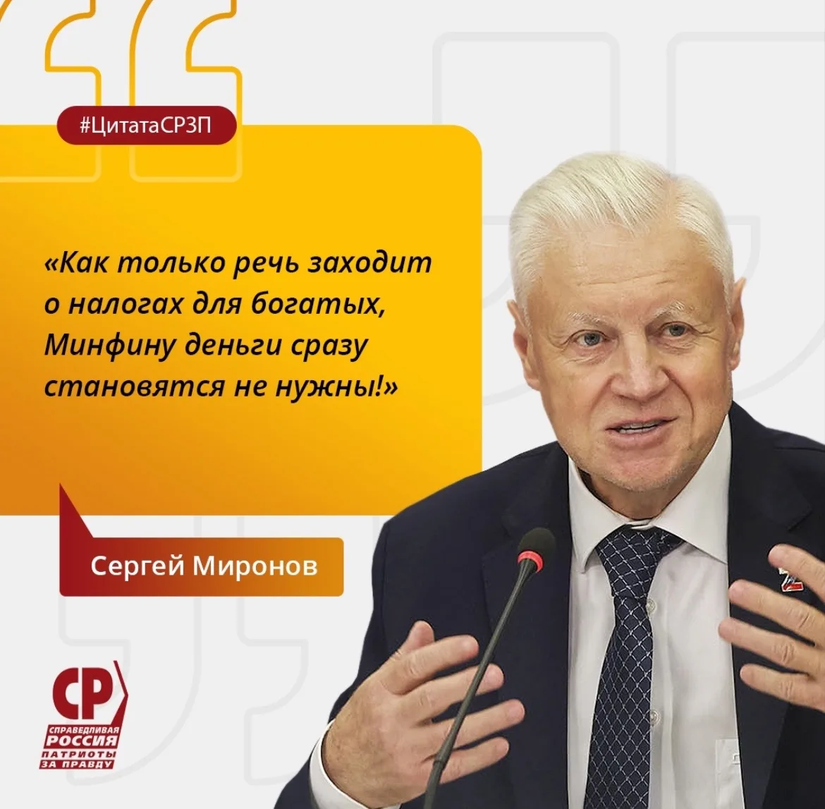 🗣 "Почему, как только речь заходит о налогах с богатых, так Минфину деньги сразу становятся не нужны? Хотя сейчас бюджет не в том положении, чтобы брезговать дополнительными доходами. И разве у нас банки наращивают кредитование в объемах, сопоставимых с их триллионными прибылями? И близко ничего подобного не происходит. Так к чему эти нелепые отговорки?! Пока сохраняются фискальные заповедники для избранных, а проблемы с госдоходами пытаются решить за счет рядовых граждан и товаропроизводителей, у нас не будет ни справедливой и эффективной налоговой системы, ни крепкого сбалансированного бюджета", – убежден Сергей Миронов.