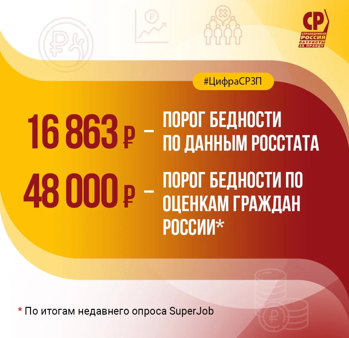 По итогам недавнего опроса SuperJob, граждане оценили порог бедности в 48 тысяч рублей в месяц. Это почти втрое выше, чем граница бедности по данным Росстата – 16 863 рубля. Очевидно, что на эти деньги можно жить только впроголодь. Народная оценка бедности вернее расчетов Росстата. Она также соответствует расчетам и исследованиям нашей партии.