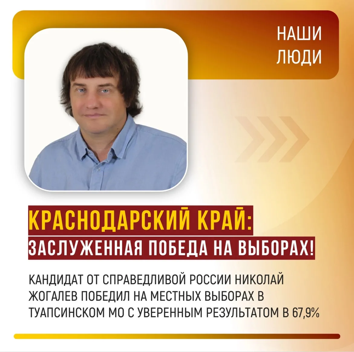 Кандидат от СПРАВЕДЛИВОЙ РОССИИ Николай Жогалев победил на муниципальных выборах с результатом 67,9%.