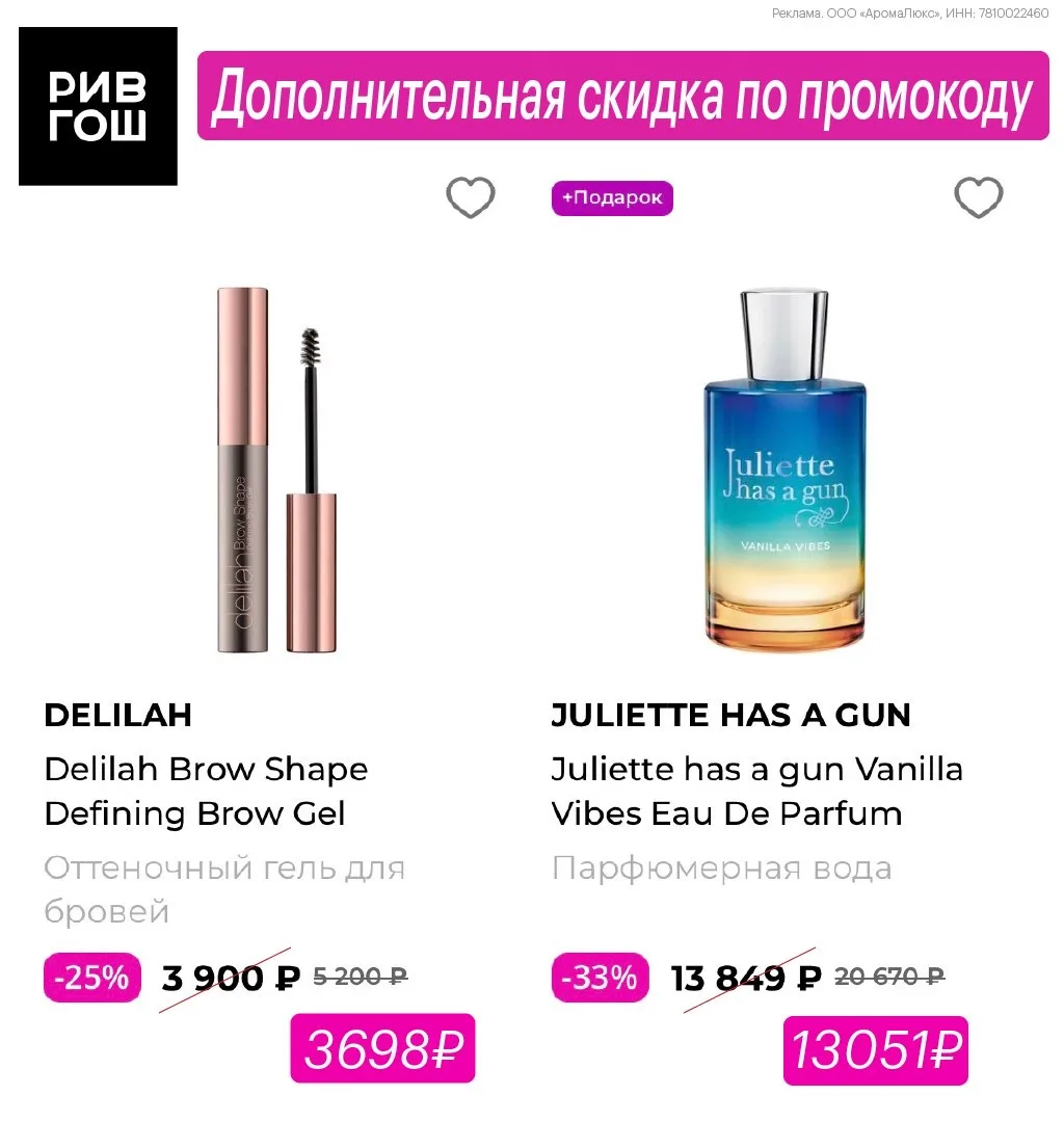 Промокод предоставляет скидку в рублях от определенной суммы заказа. Скидка по промокоду применяется к базовой цене, без учета скидки по программе лояльности (Золотой карте РИВ ГОШ), действующих на текущий момент акций и специальных цен. Промокод не действует на марки-исключения (указаны в Правилах акции) и подарочные сертификаты. К заказу можно применить только один промокод.