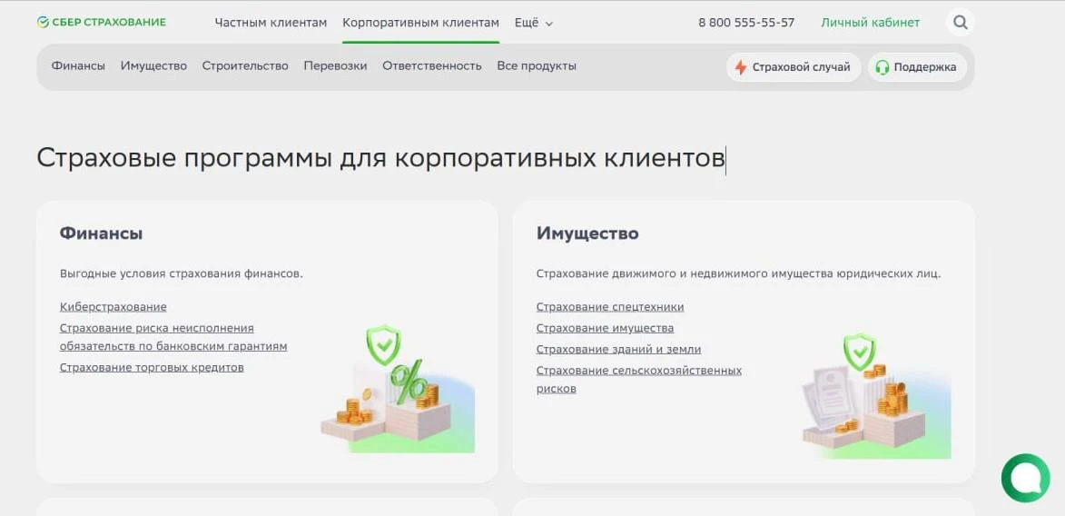 - В разделе «Корпоративным клиентам» нет категории «Финансовые риски». Оставлены только киберриски, банковские гарантии и торговые кредиты.