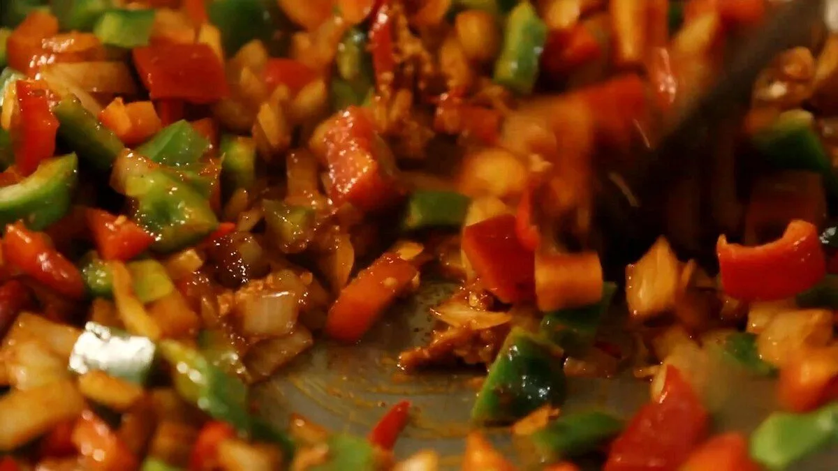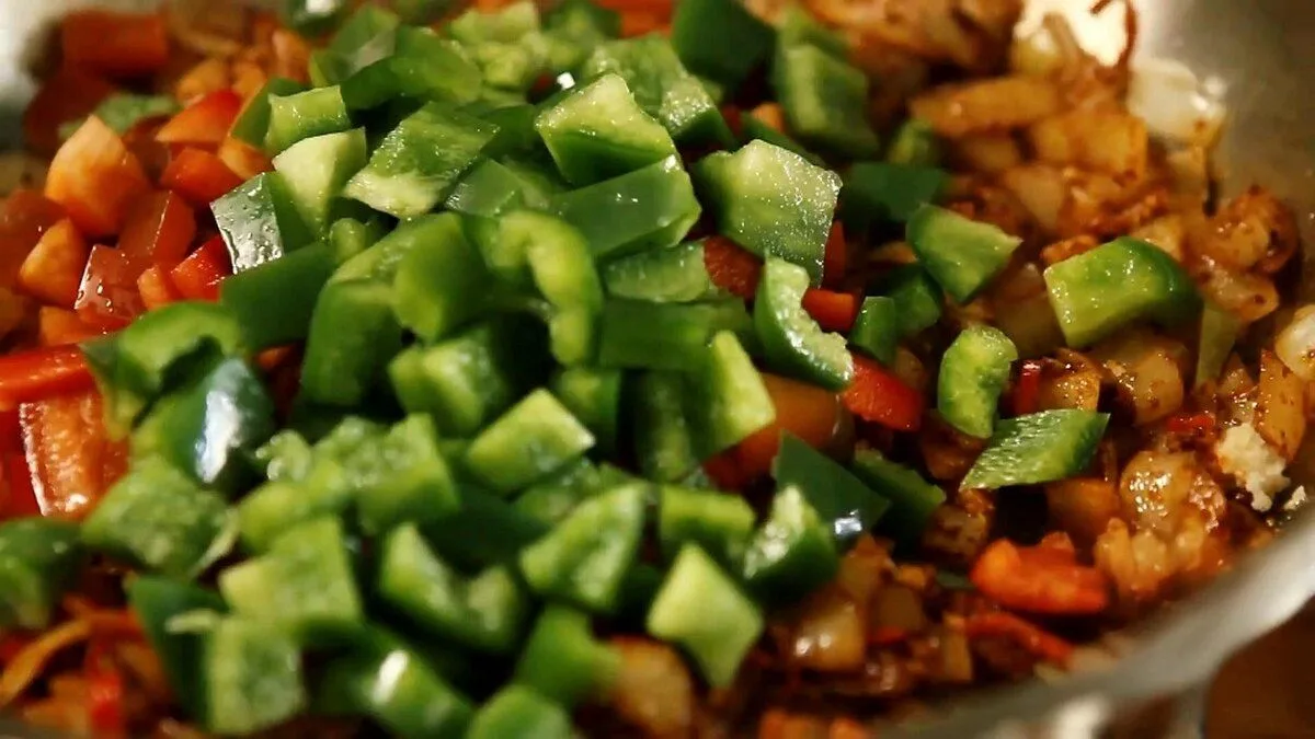 3. Добавьте нарезанный кубиками красный и зеленый болгарский перец и посолите. Готовьте 3 минуты.