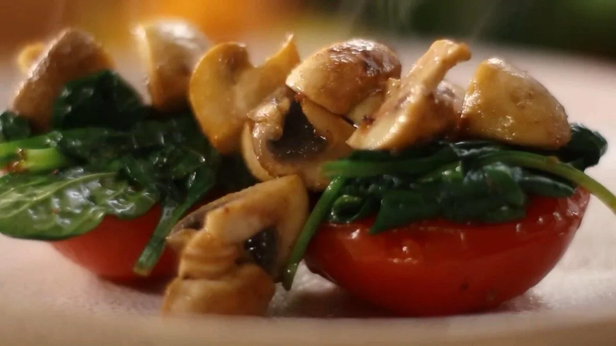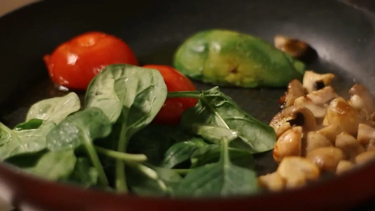 3. Когда помидоры и грибы приготовятся добавьте авокадо и шпинат. Выключите огонь.