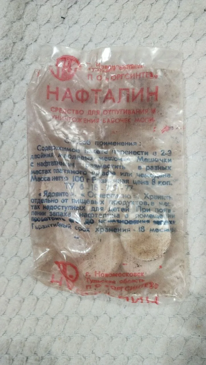 Нафталин в СССР использовали в быту как средство против моли. Вещество продавалось в хозяйственных магазинах в основном в виде шариков.