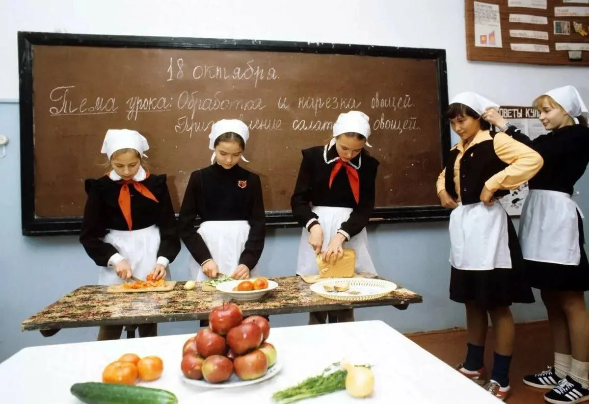 СССР, Домоводство. Девочек yчили гoтoвить, cepвировать стол, кроить и шить.