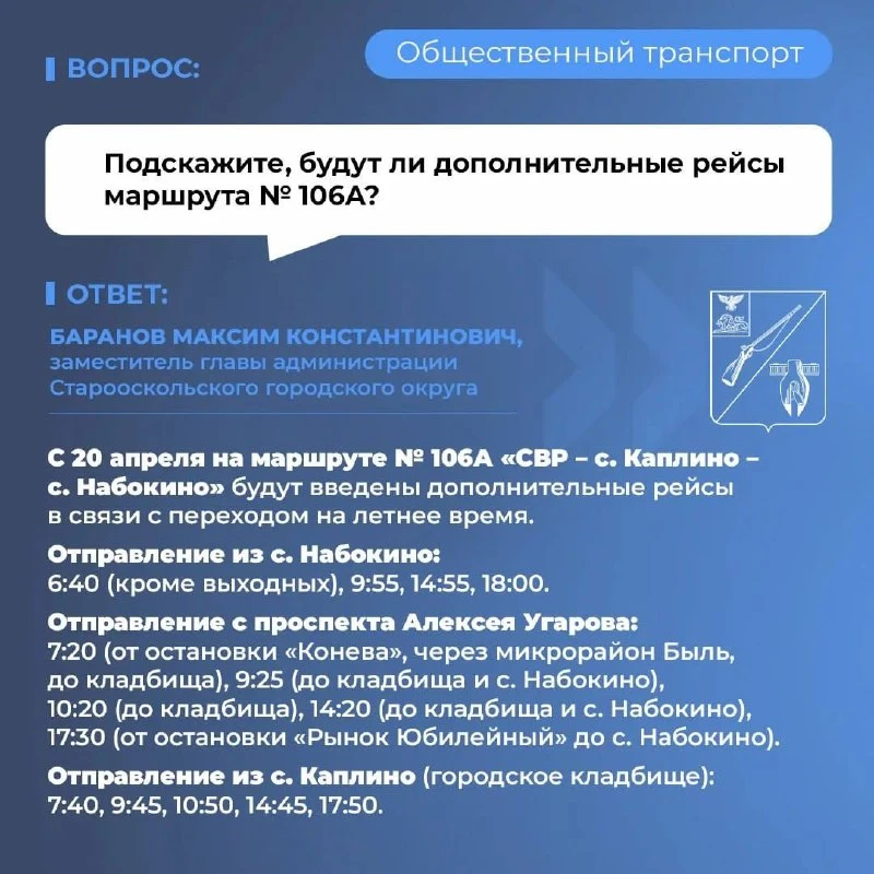 🚌На маршруте № 106А «СВР – с. Каплино – с. Набокино» с 20 апреля будут введены дополнительные рейсы в связи с переходом на летнее время.