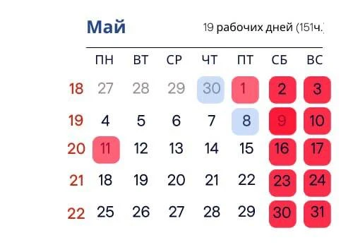 Если вы зачем-то ждёте майские, то знайте, что там всего +2 выходных: 1 и 11 мая, а все остальные — рабочие