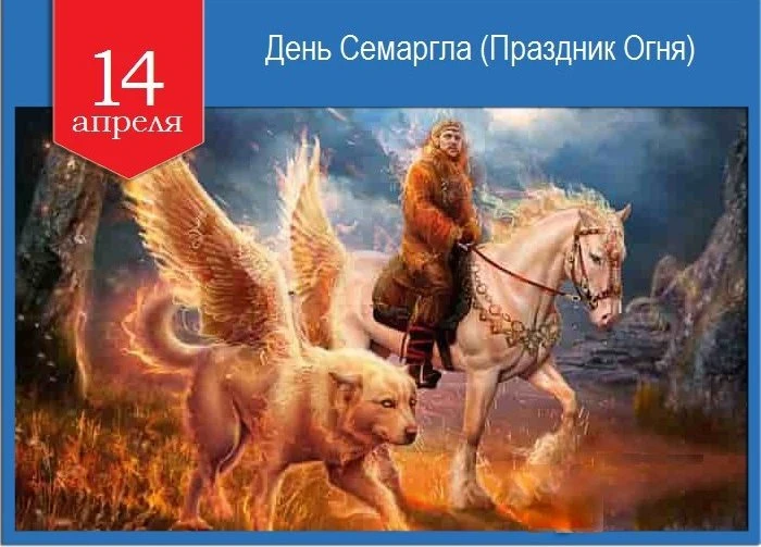 14 апреля — День Семаргла, огненного стража славян (Огнебога). Его имя упоминается в русских летописях — пантеон князя Владимира. Произошло оно, предположительно, от старорусского «смага» («За ним кликну Карна и Жля поскочи по Русской земли, Смагу мычючи в пламяне розе») то есть, огонь, языки пламени.