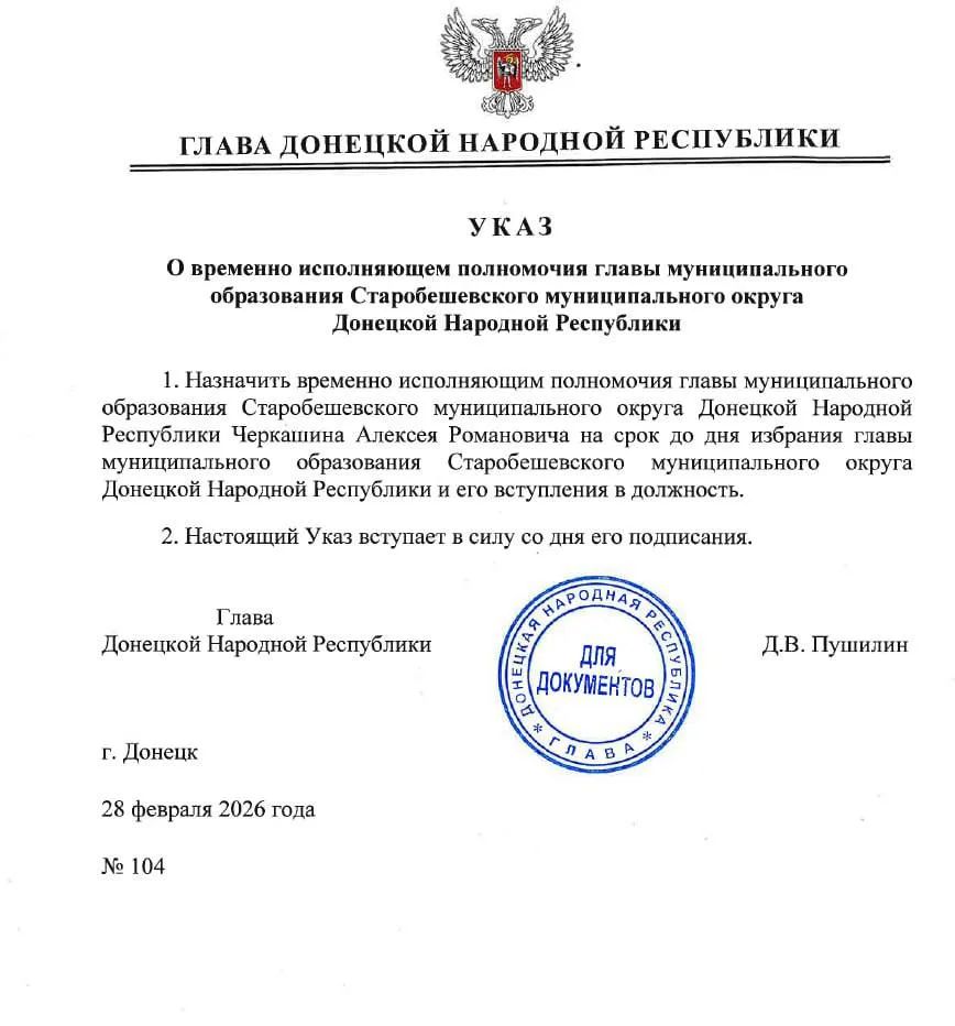Денис Пушилин назначил финалиста кадрового конкурса «Донбасс. СВОи Герои» Черкашина Алексея Романовича временно исполняющим полномочия Главы муниципального образования Старобешевского муниципального округа