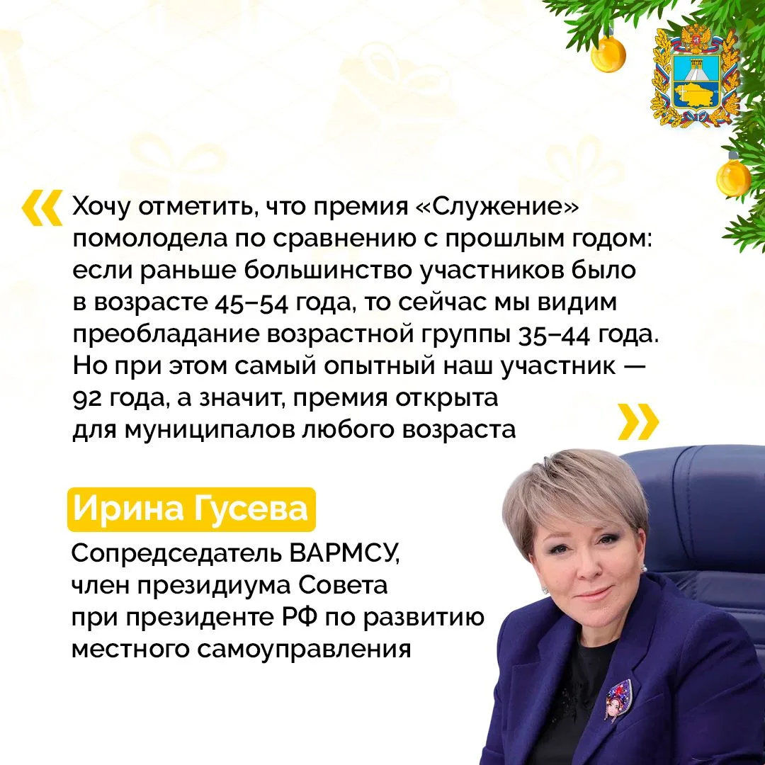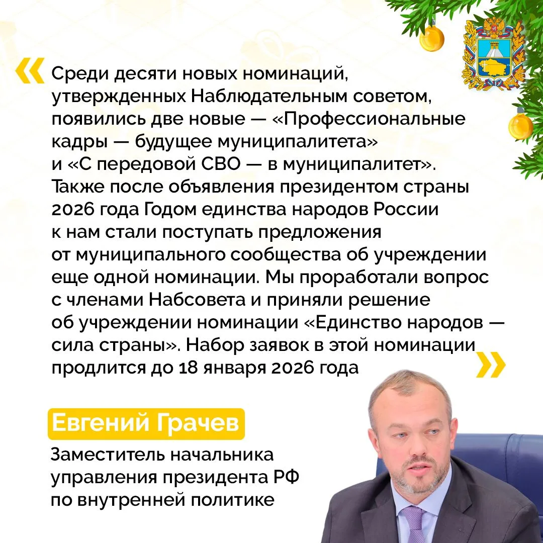 Кроме того, у премии появилось дополнительное конкурсное направление — «Единство народов — сила страны». Заявки в этой номинации принимаются до 18 января 2026 года на сайте премияслужение.рф