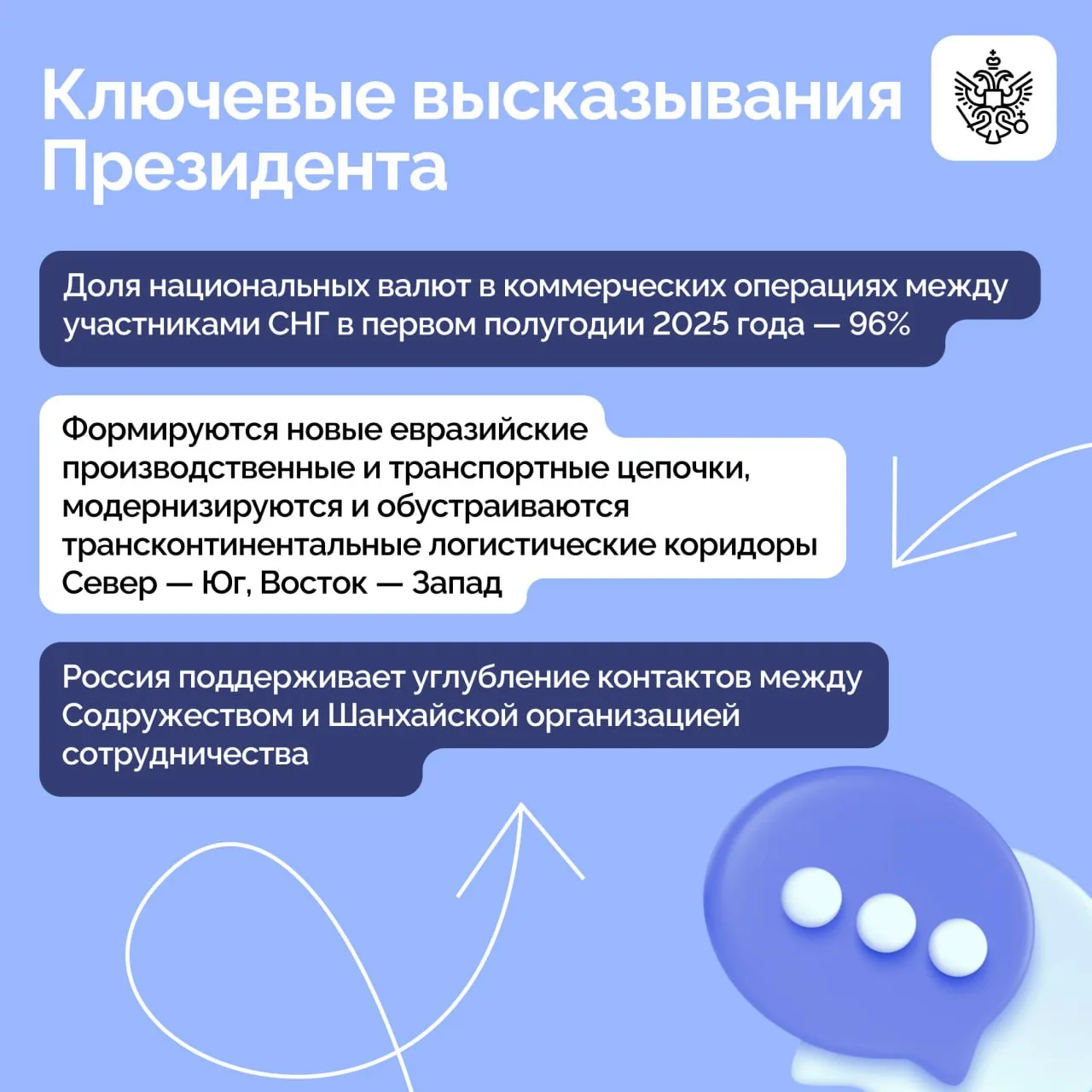 Он подчеркнул, что страны Содружества выстраивают устойчивую и независимую от внешнего влияния финансовую инфраструктуру, а также общее гуманитарное пространство.
