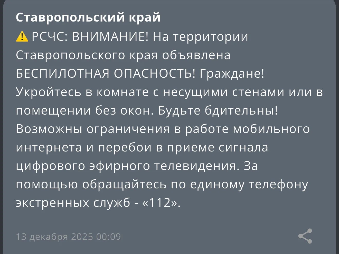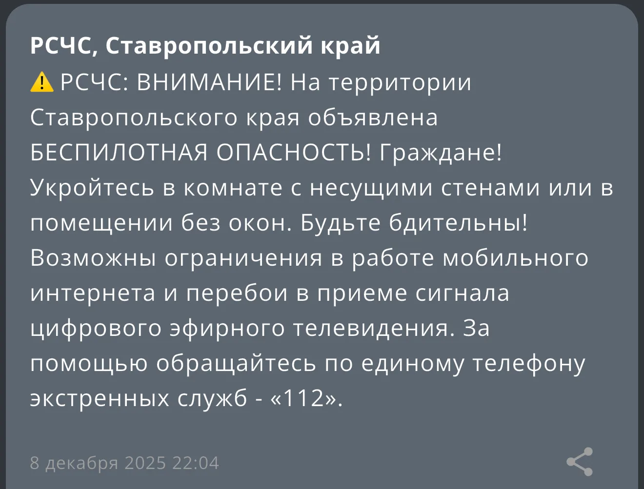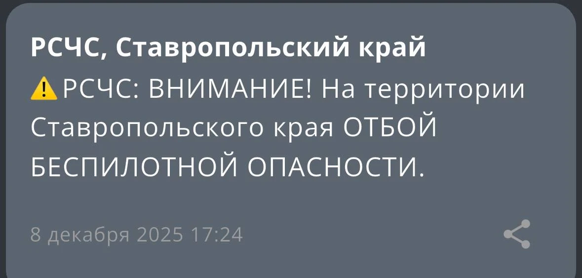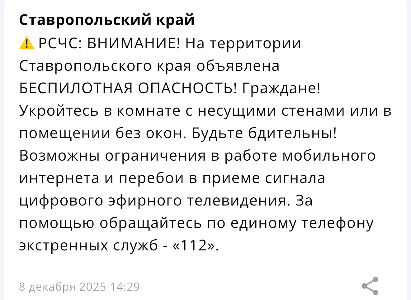 ⚠️ На территории Ставропольского края ОТБОЙ БЕСПИЛОТНОЙ ОПАСНОСТИ.