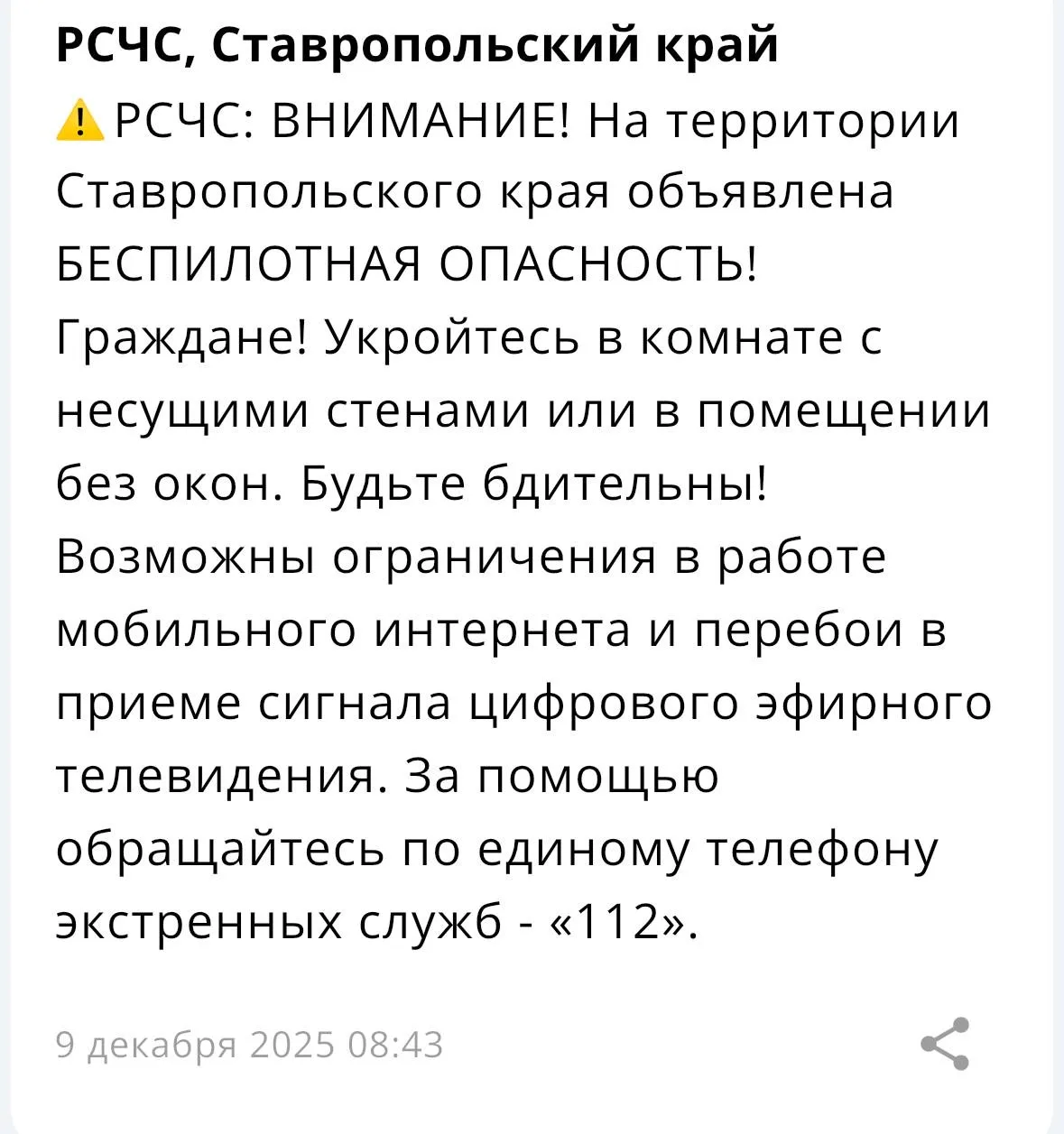 ❗️ На территории Ставропольского края объявлена «Беспилотная опасность».