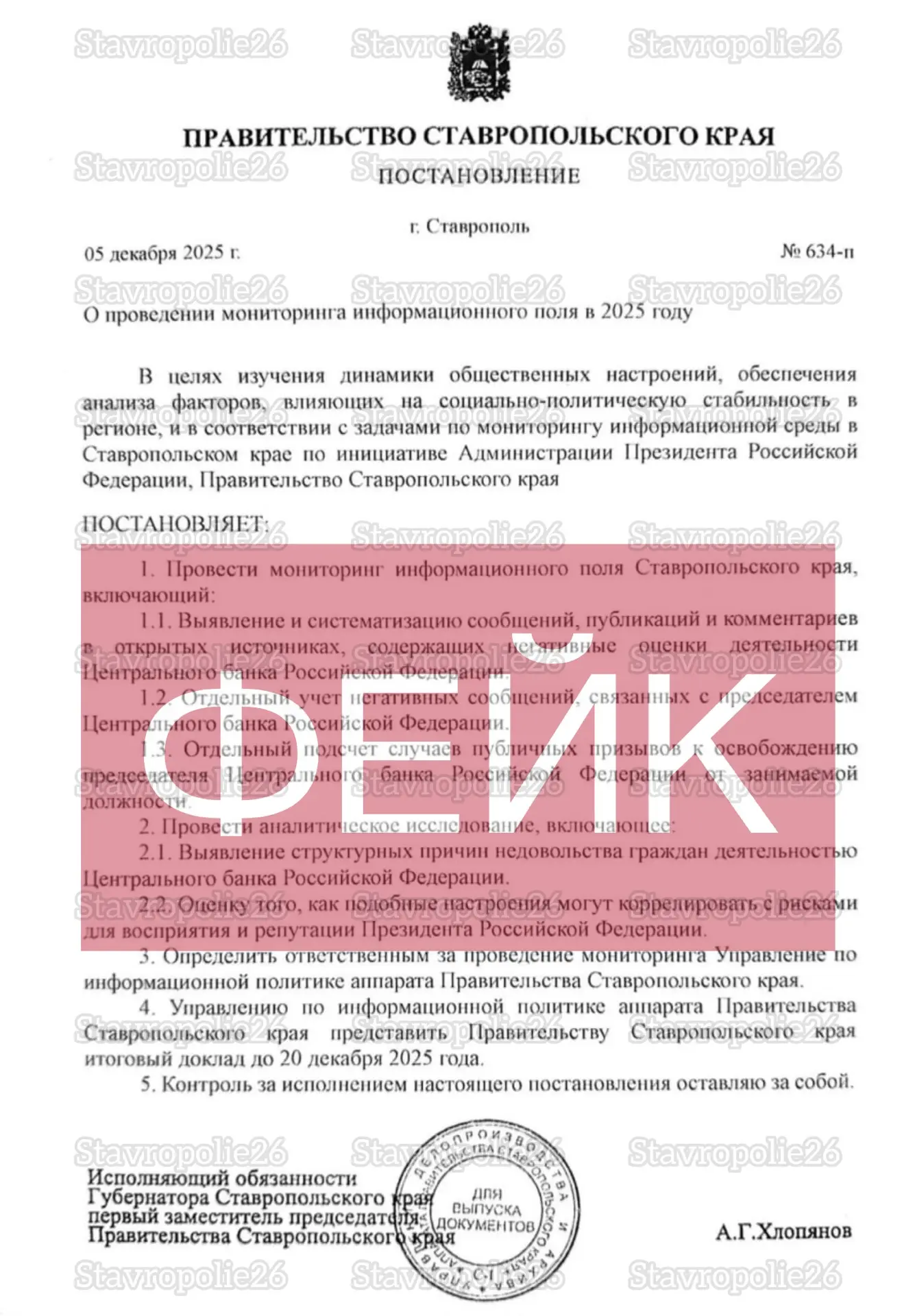 ⚡️ В сети распространяется информация о том, что на Ставрополье собирают информацию о публикациях, содержащих оценку деятельности Центробанка. Выявляет граждан, недовольных работой ЦБ.