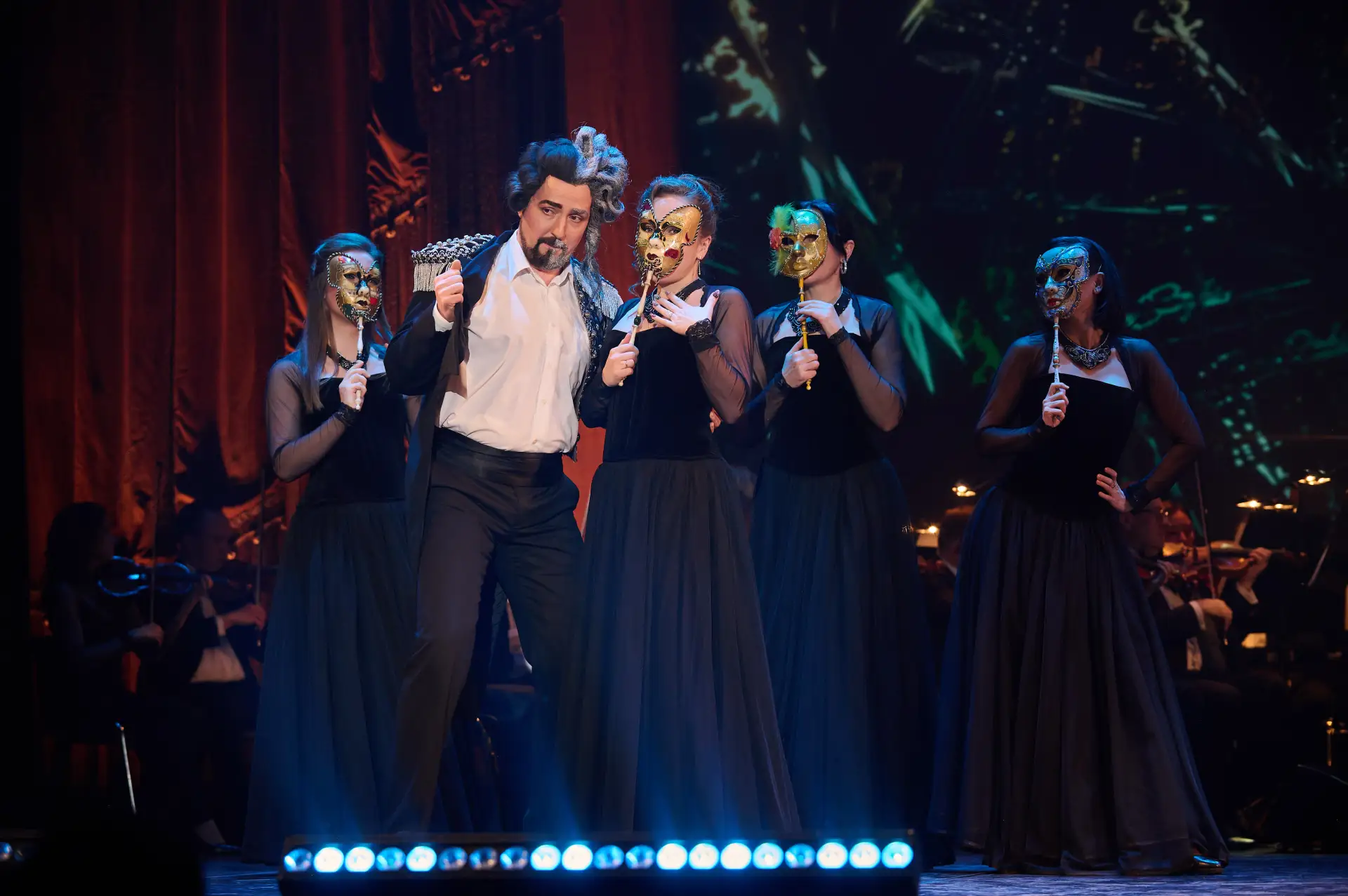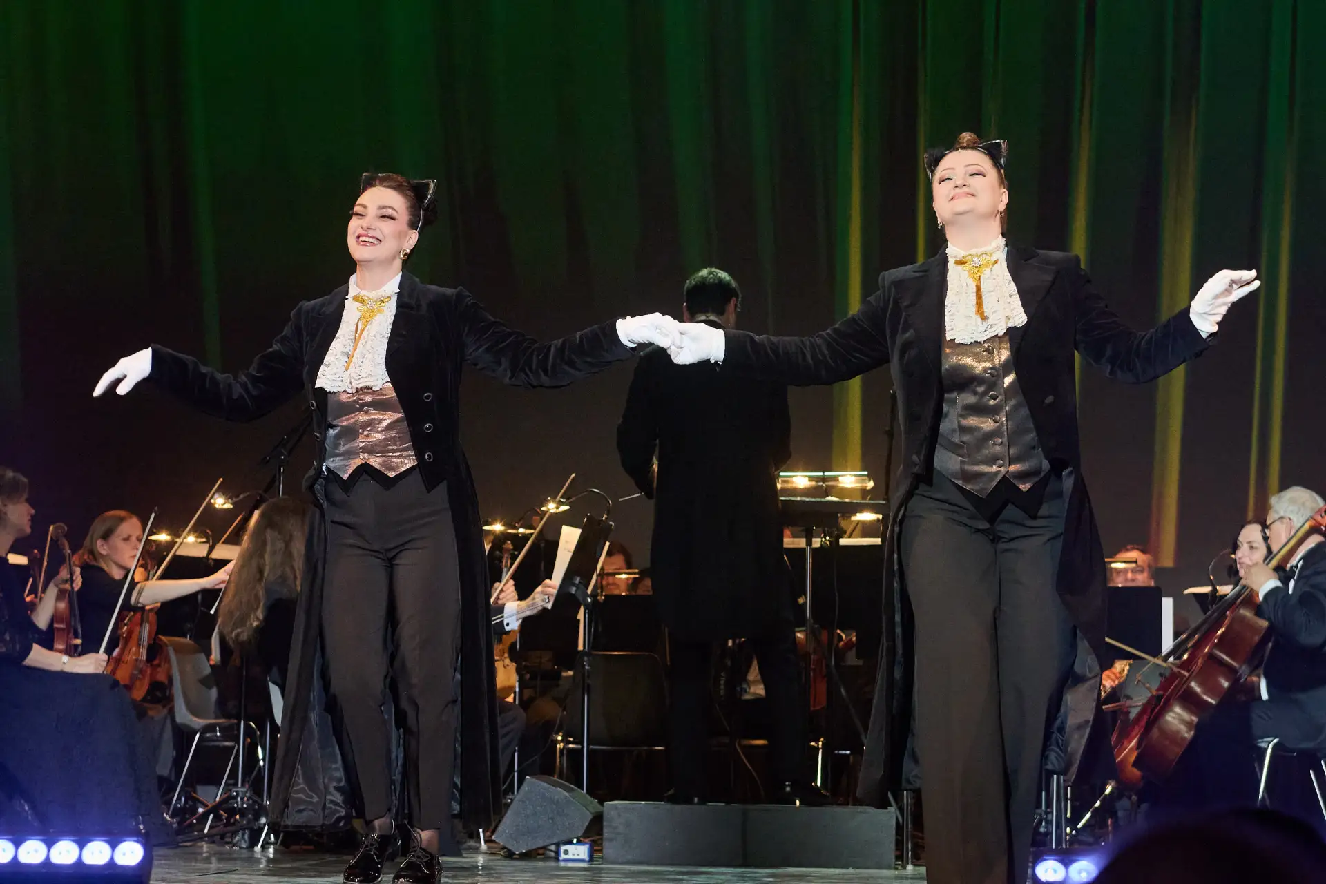 Ведущими праздничного музыкального представления, подготовленного Московским театром «Геликон-опера» под руководством Дмитрия Бертмана, выступили артисты Олег Лопухов и Илья Оршанский, которые предстали в образе бродячих актеров Аркадия Счастливцева и Геннадия Несчастливцева из пьесы А.Н. Островского «Лес».