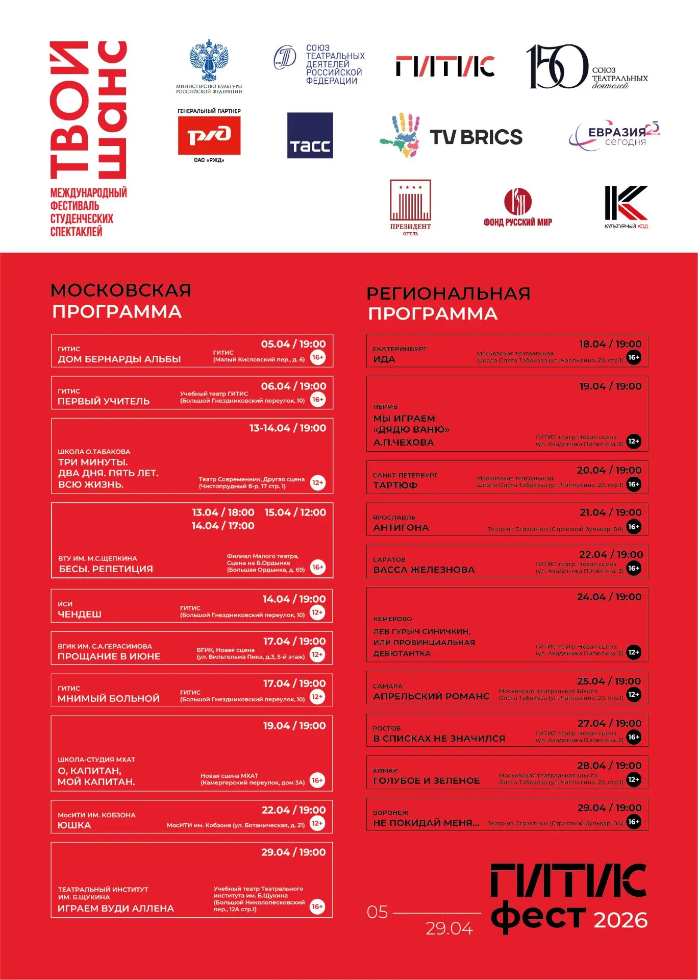 В 2026 году в основную афишу войдут 11 спектаклей, отобранных экспертным советом фестиваля. Русский язык будет представлять Московский Губернский театр со спектаклем «Остров сокровищ».