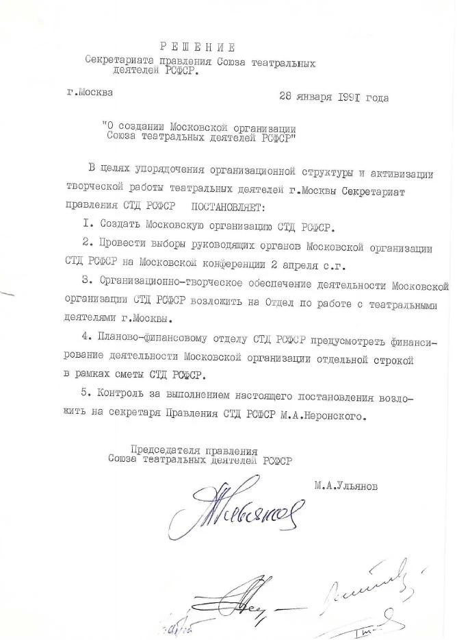Решением Секретариата СТД РСФСР организационно-творческое обеспечение деятельности Московской организации было поручено Отделу по работе с театральными деятелями города Москвы, а финансирование — Планово-финансовому отделу. Контроль за выполнением постановления возложен на Секретаря Правления СТД РСФСР Михаила Неронского.