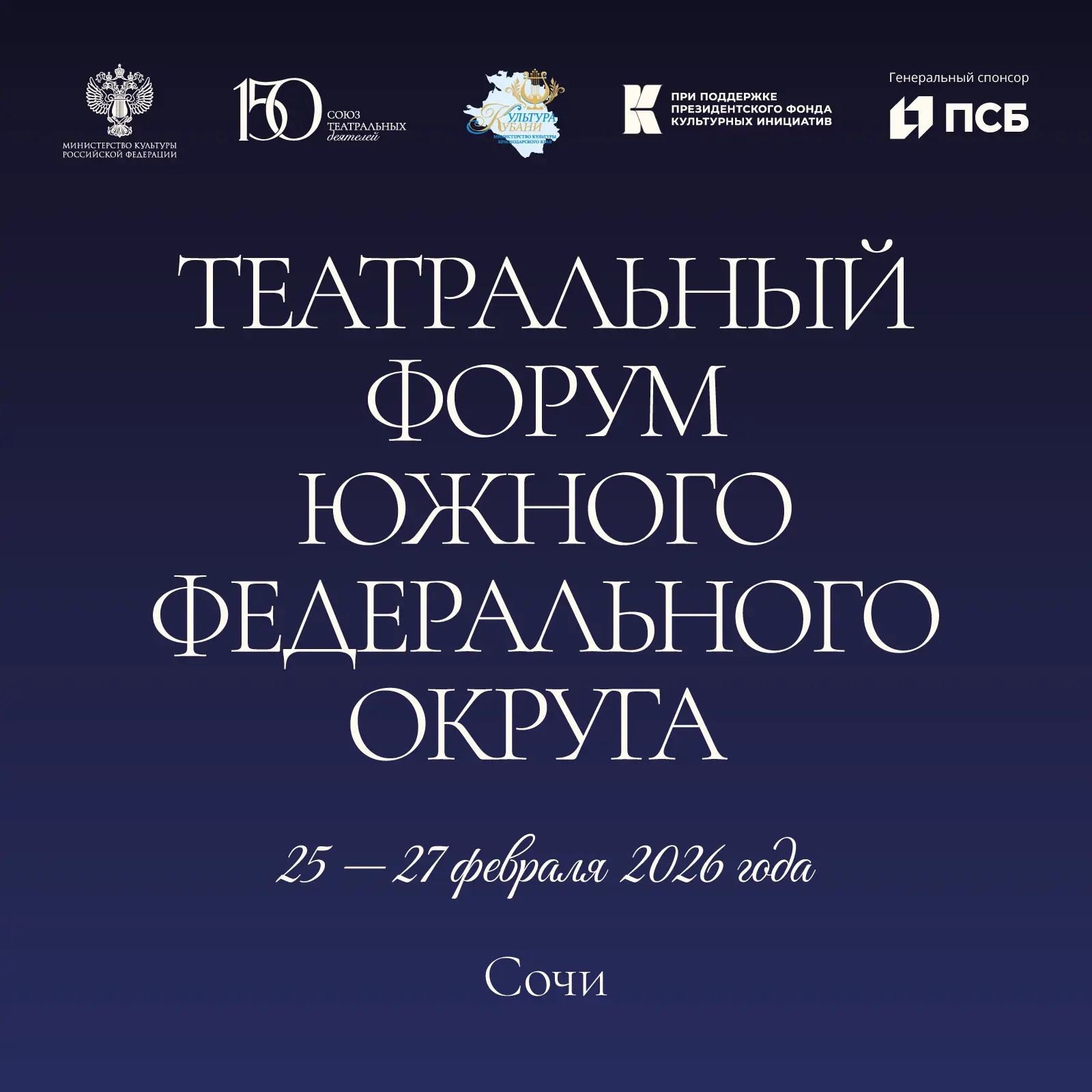 Театральный форум Южного федерального округа пройдет в рамках проекта «Театр России. От наследия к инновациям» при поддержке Минкультуры России и Президентского фонда культурных инициатив. Генеральный партнер — Банк ПСБ.
