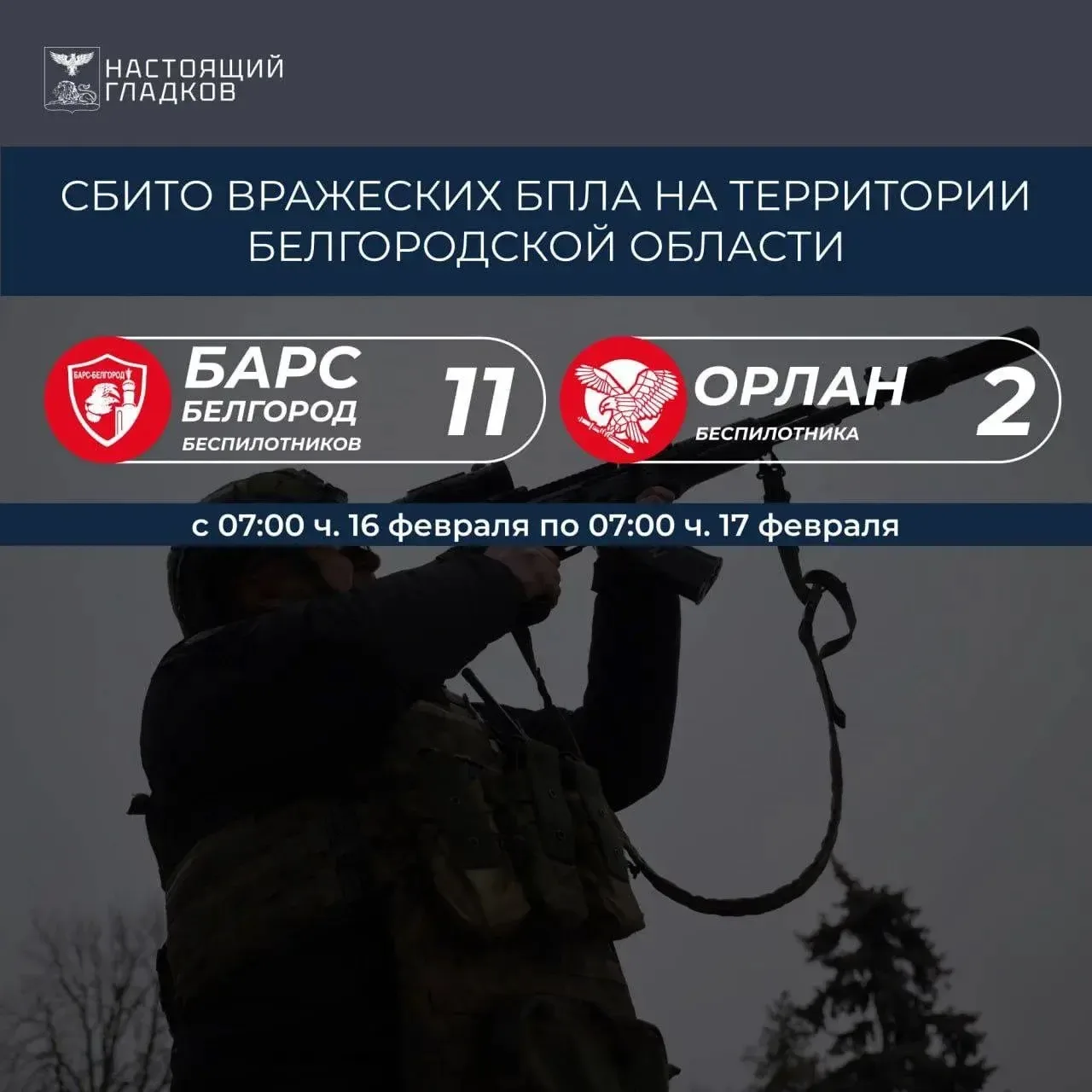 С 07:00 16 февраля по 07:00 17 февраля подразделениями «БАРС-Белгород» и «Орлан» ликвидировано 13 вражеских беспилотника.