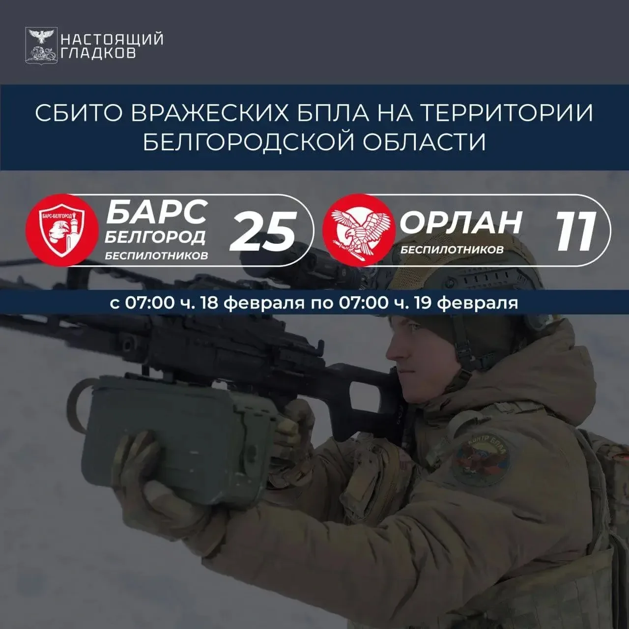С 07:00 18 февраля по 07:00 19 февраля подразделениями «БАРС-Белгород» и «Орлан» ликвидировано 36 вражеских беспилотника.