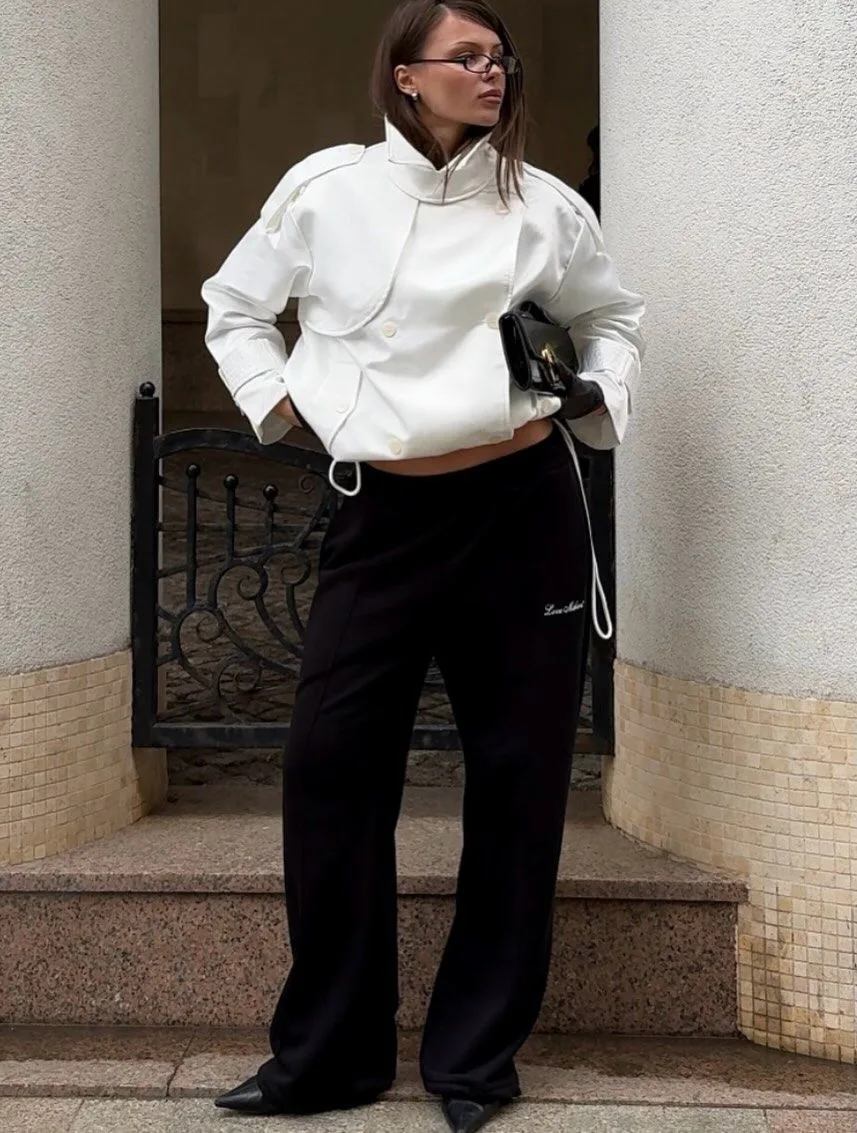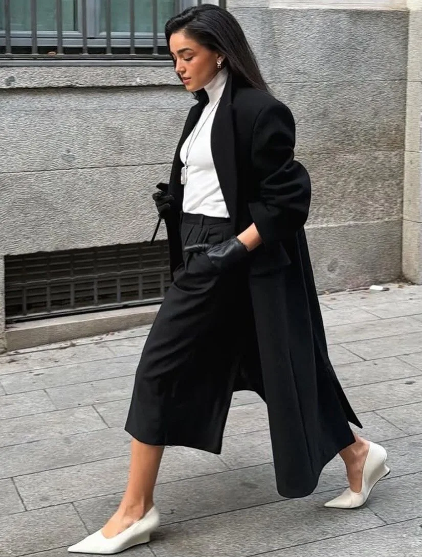 Черно-белая гамма — это абсолютный маст-хэв, который не подвластен времени. В 2026 году дизайнеры предлагают отказаться от строгой "офисной" монохромности в пользу графичности, контраста фактур и игры пропорций.