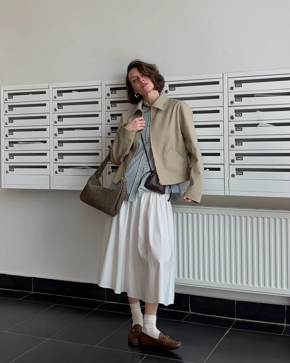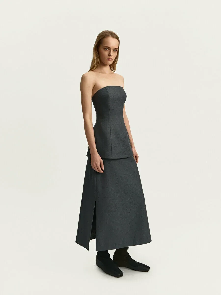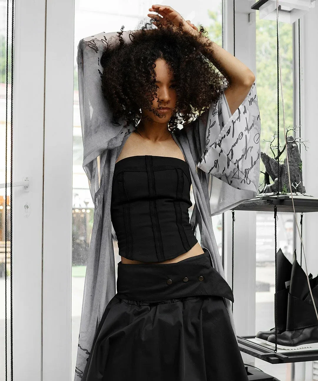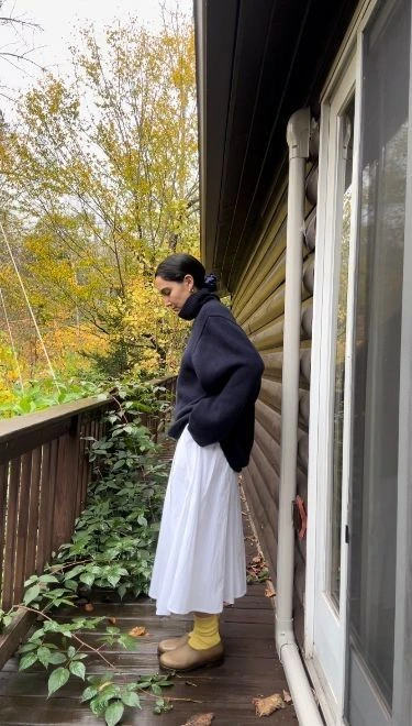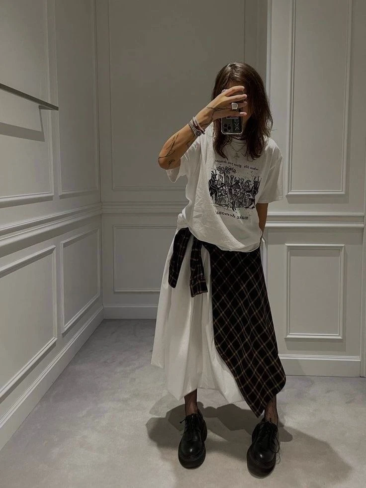 Стилист Лотта Волкова выбрала образы, представляющие собой синтез классики и бунтарства. Например, серая вязаная рубашка с короткими рукавами поверх белой рубашки и юбка миди с заниженной талией.
