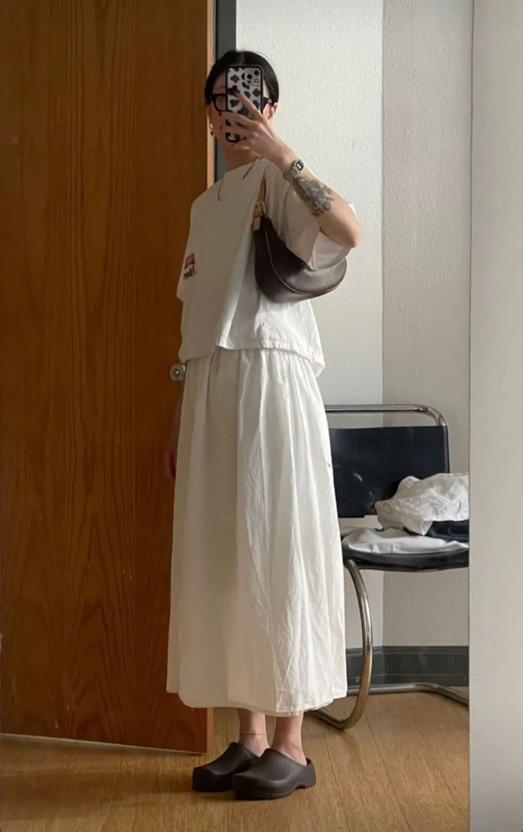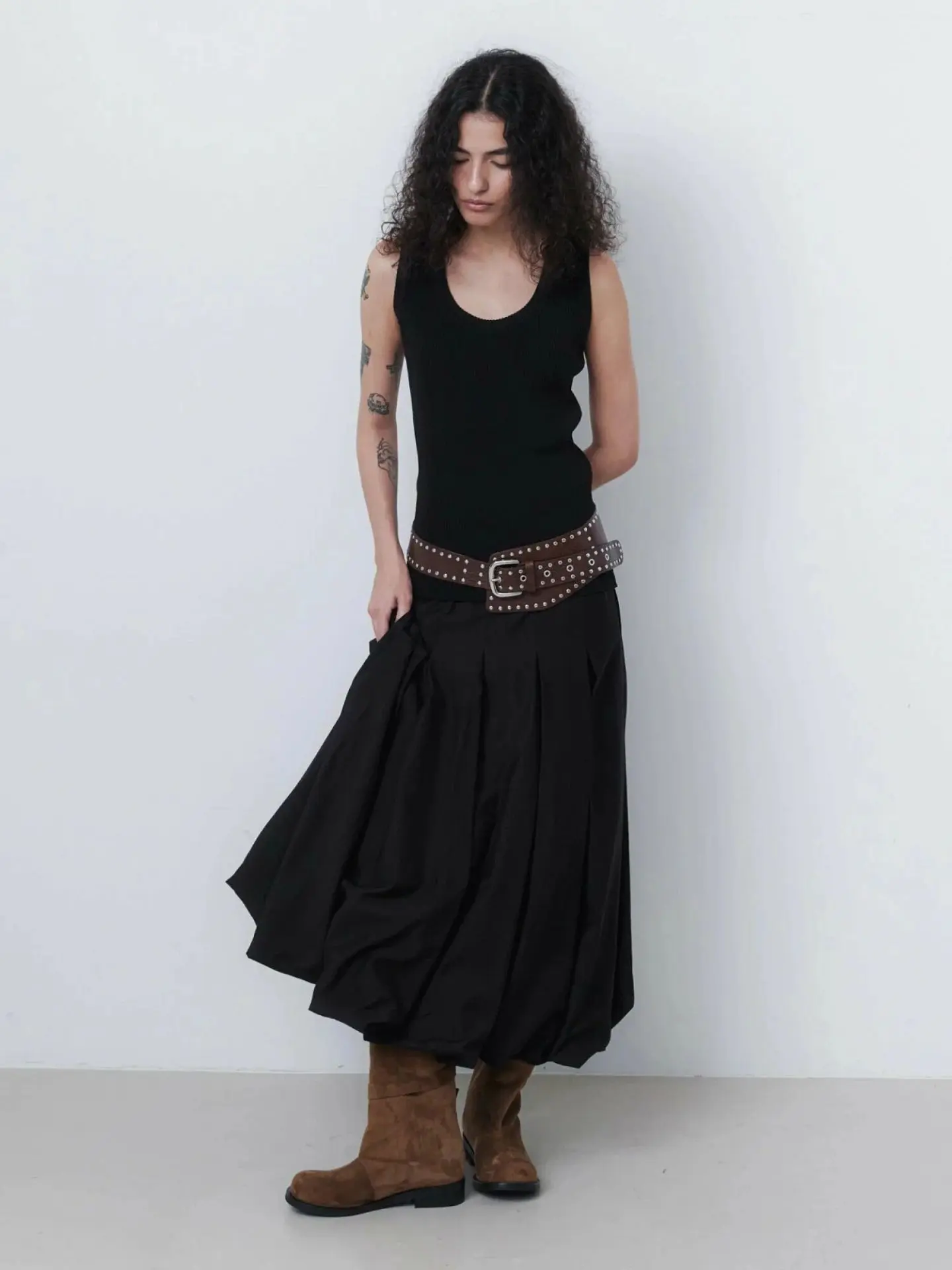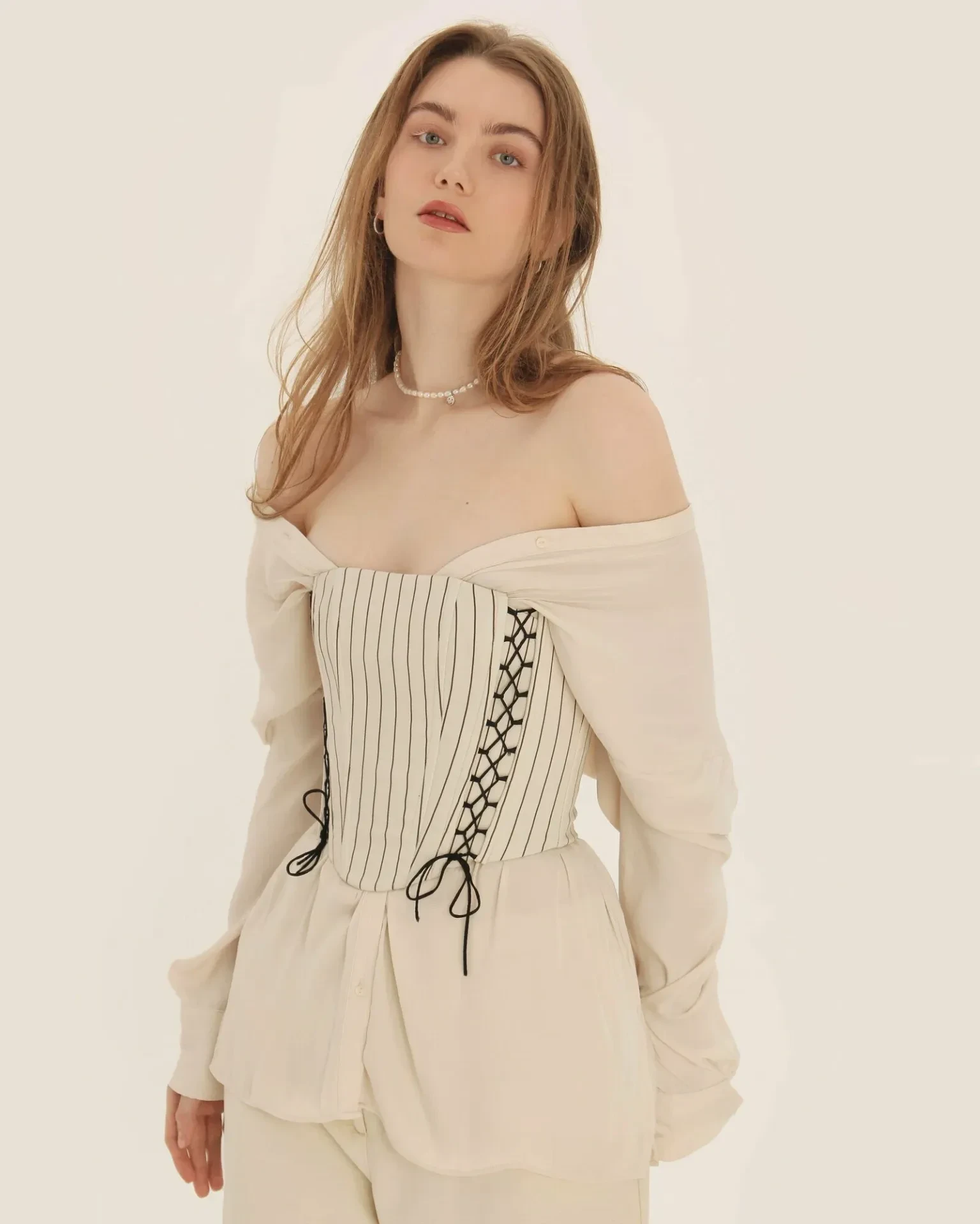 Стилист Лотта Волкова выбрала образы, представляющие собой синтез классики и бунтарства. Например, серая вязаная рубашка с короткими рукавами поверх белой рубашки и юбка миди с заниженной талией.