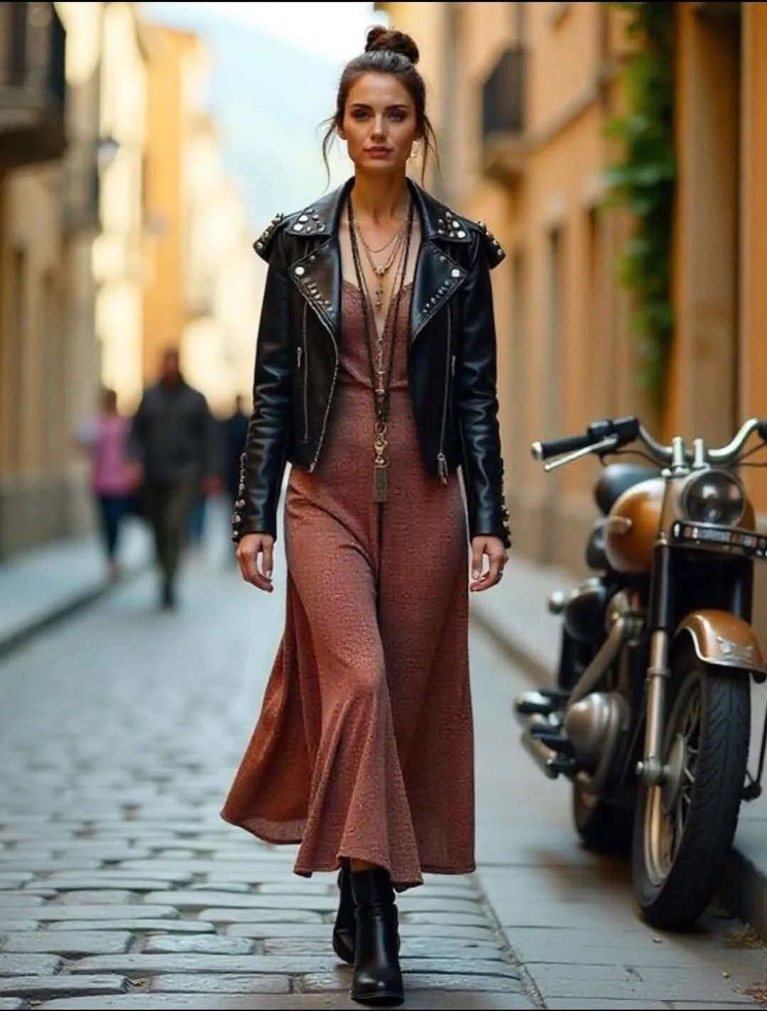 Это очень интересный и концептуальный замес. Мото (кожа, металл, грубые фактуры, асимметрия) и бохо (этно-узоры, струящиеся ткани, бахрома, натуральные камни) действительно играют на контрастах: жёсткое против мягкого, индустриальное против природного.