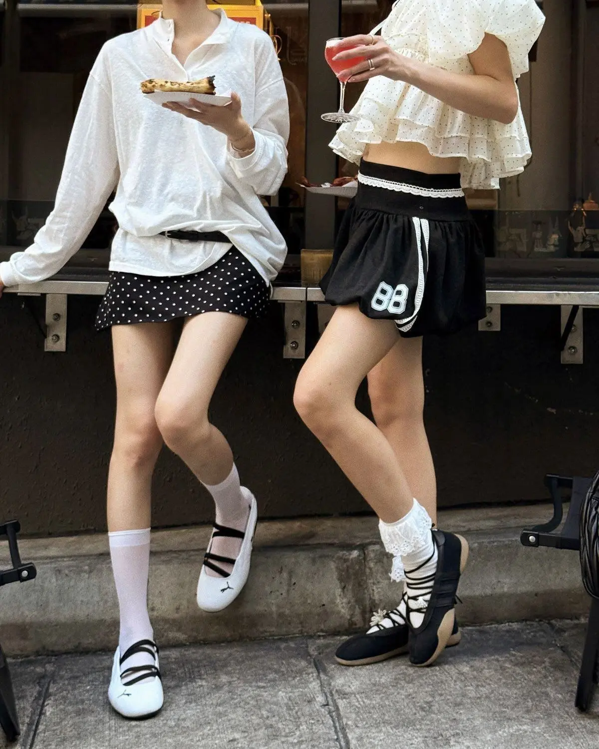- Похожие силуэты: например, платья с пышными юбками у обоих или джинсы с милыми блузами.