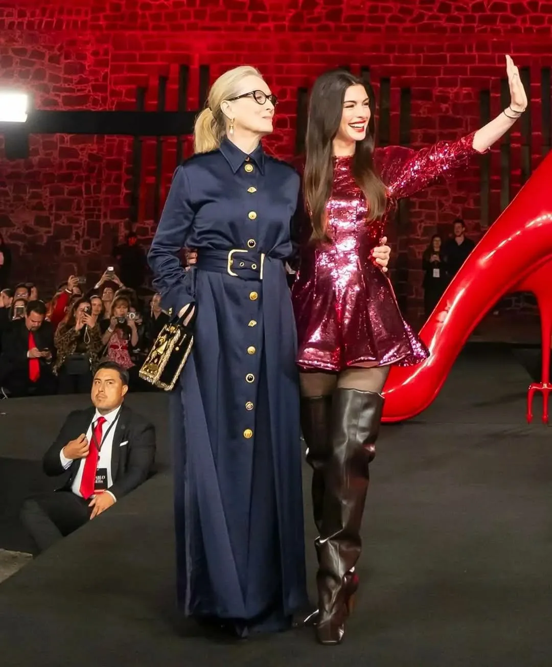 На мексиканской премьере Мерил Стрип надела потрясающее длинное темно-синее платье от Schiaparelli, которое с золотыми пуговицами и выразительным силуэтом напомнило всем незабываемый образ Миранды Пристли https://dzen.ru/a/ac58MWtDzRTiSeIj