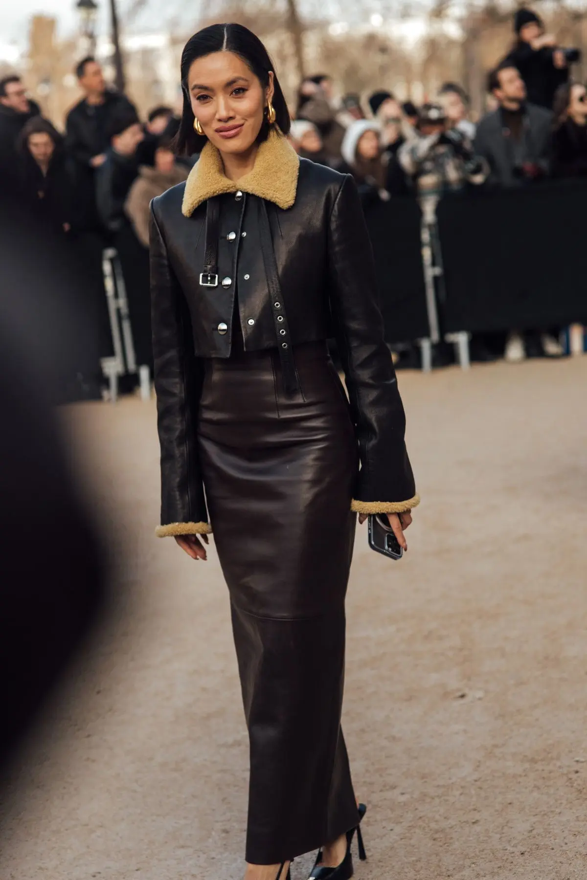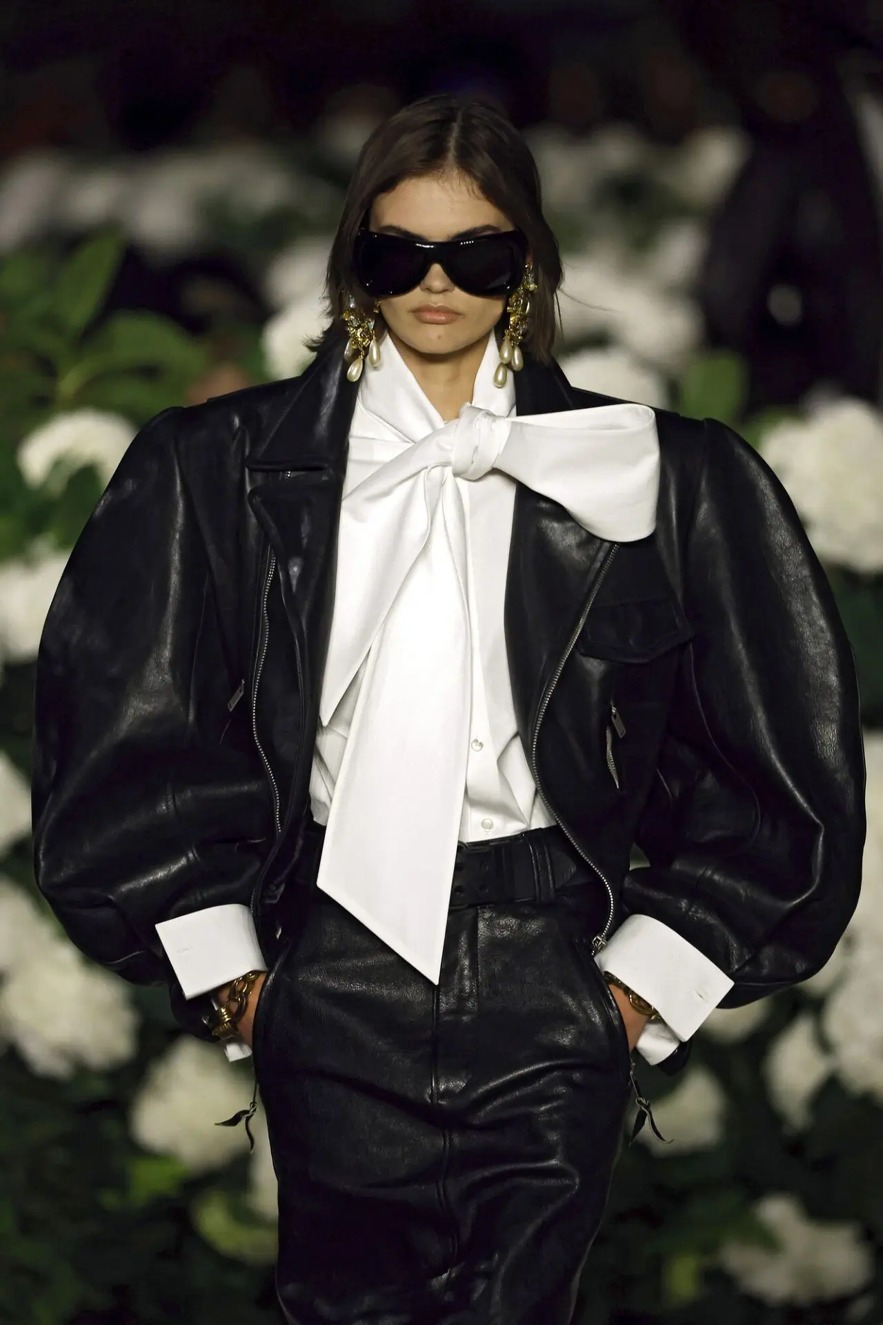 Среди самых популярных вариантов, конечно же, объемные кожаные куртки — уже несколько сезонов кожаная куртка такого стиля пользуется особым спросом. Также гости отдавали предпочтение так называемым бомберам.