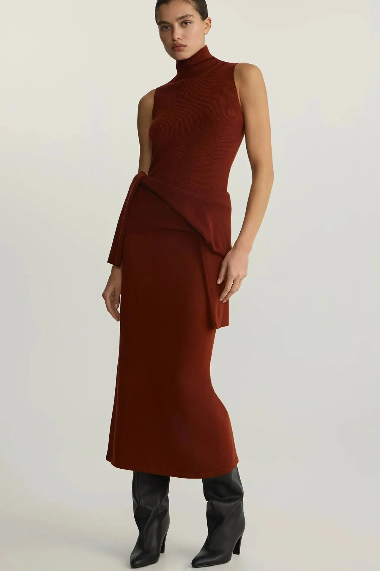 2Mood, топ, 9980 руб. юбка, 16 980 руб. Классный комплект из шерсти мериноса. Сверху можно накинуть жакет или кардиган из капсулы. Терракотовый тотал лук выглядит очень эффектно.