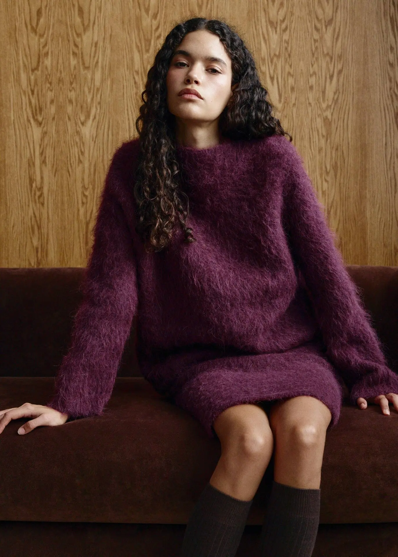 Sela джемпер, 7999 руб. юбка, 4999 руб. Комплект в моднейшем сливовом оттенке. Хорошо будет сочетаться и с грубыми ботинками, и с сапогами на каблуке.