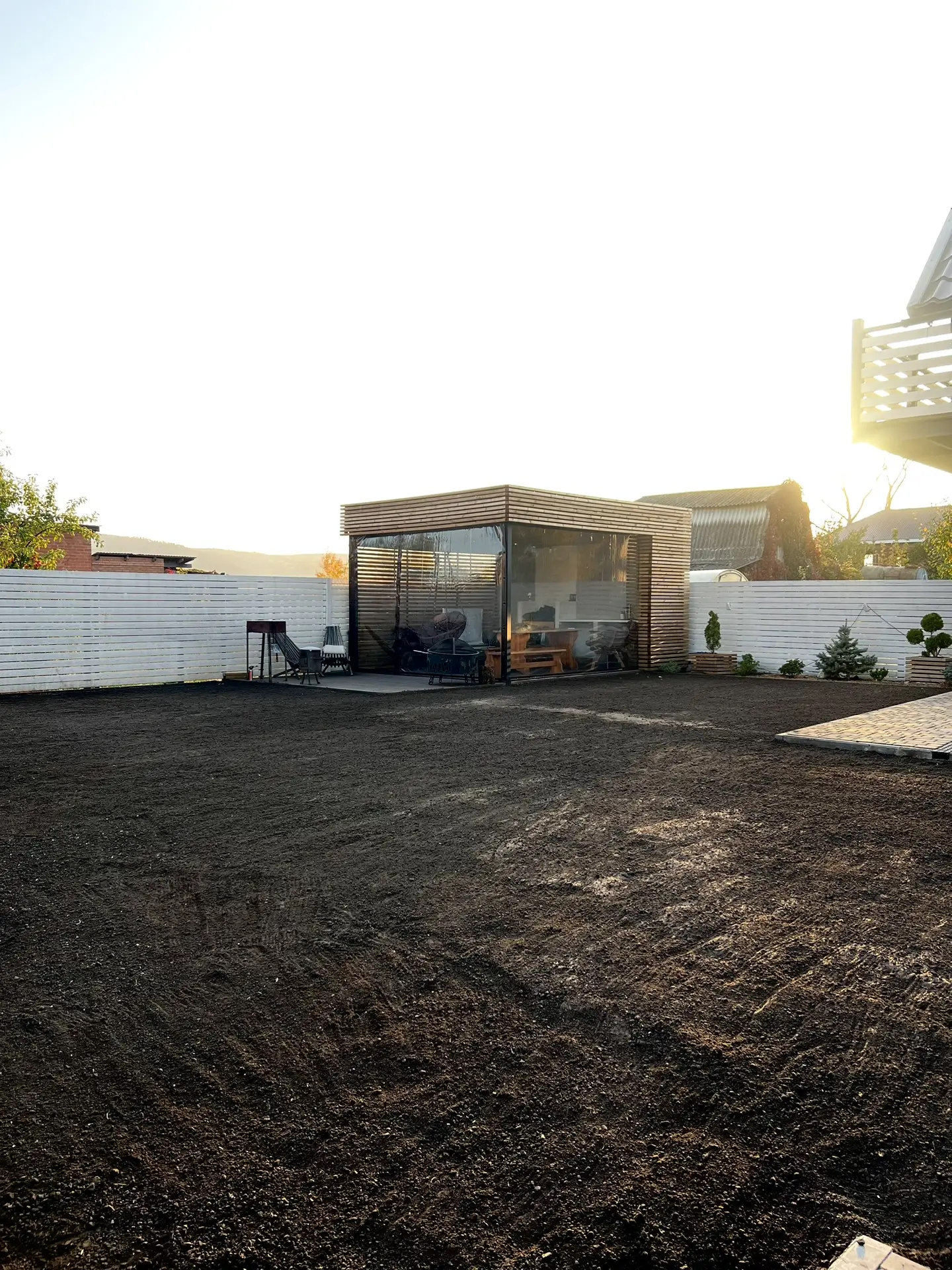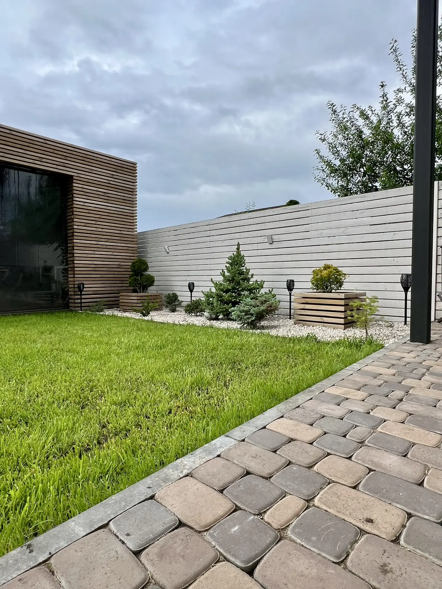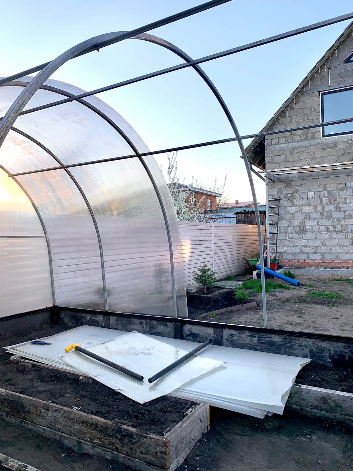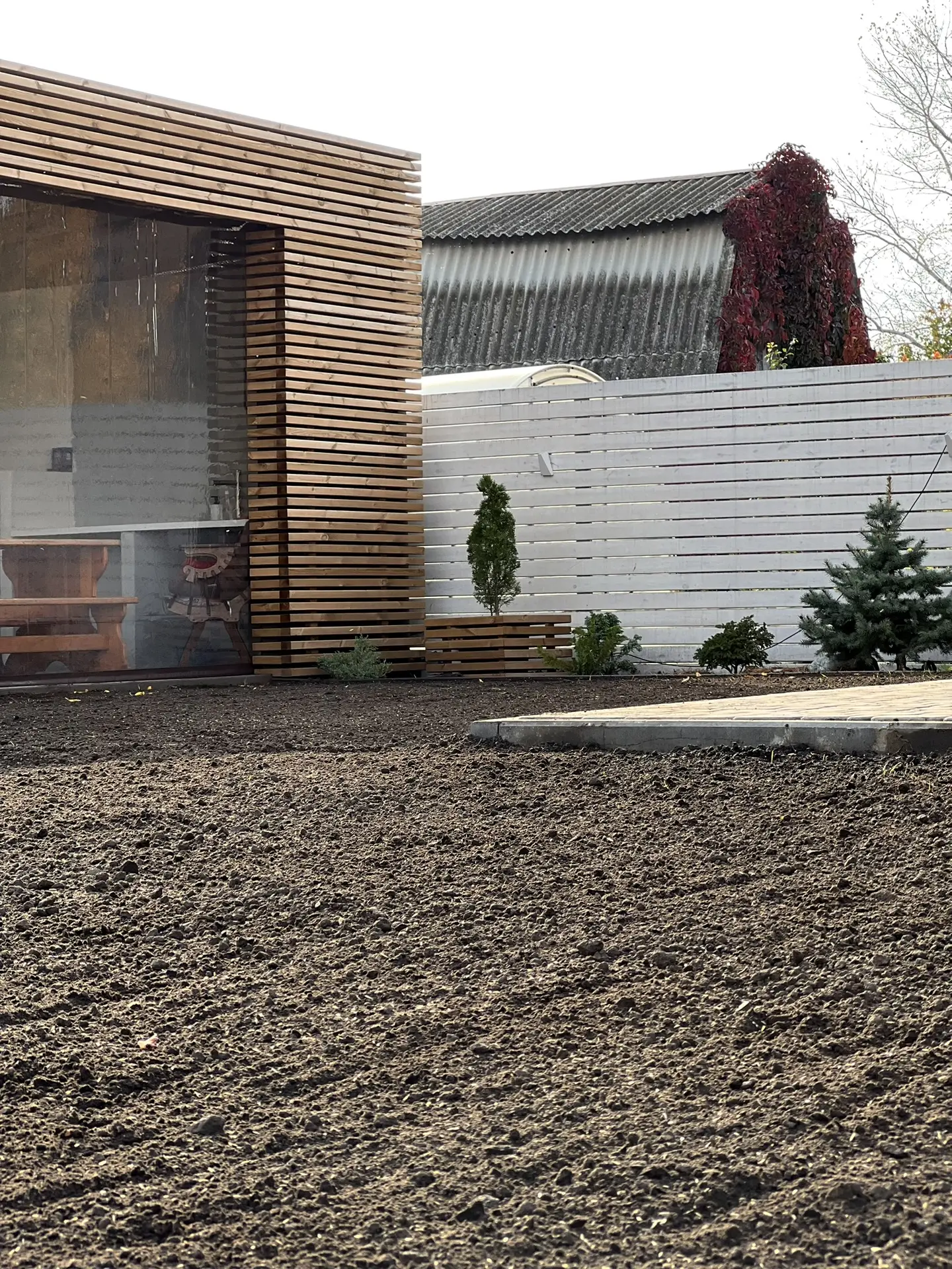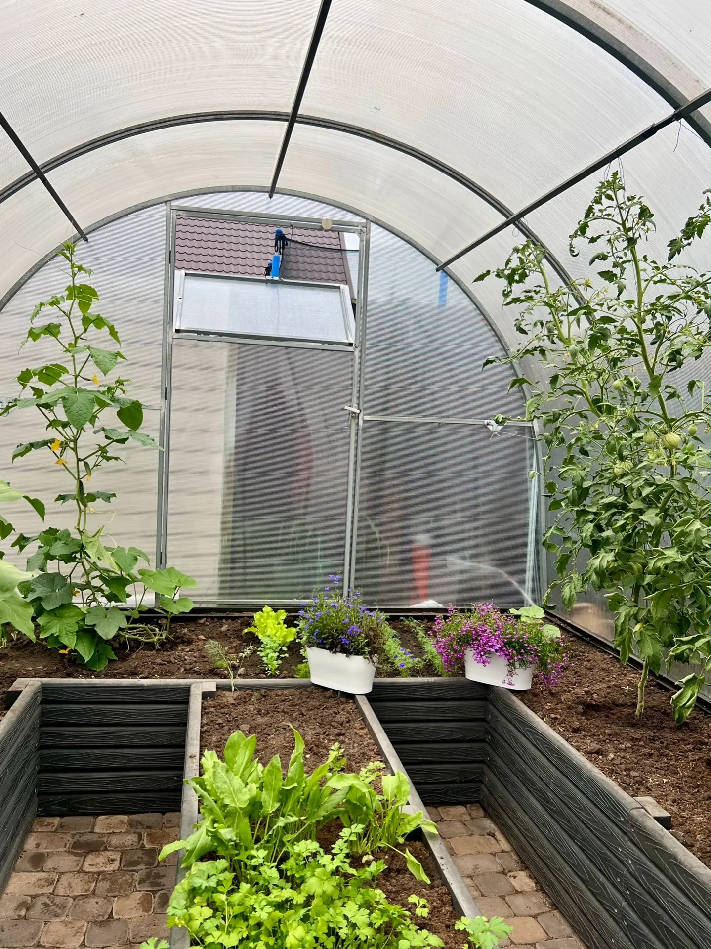 Сейчас на месте той теплицы стоит беседка с летней кухней, а огород мы перенесли в другое место. Там мы сделали свайный фундамент под новую теплицу, высокие грядки обшили декоративными ламелями, а дорожки выложили брусчаткой.