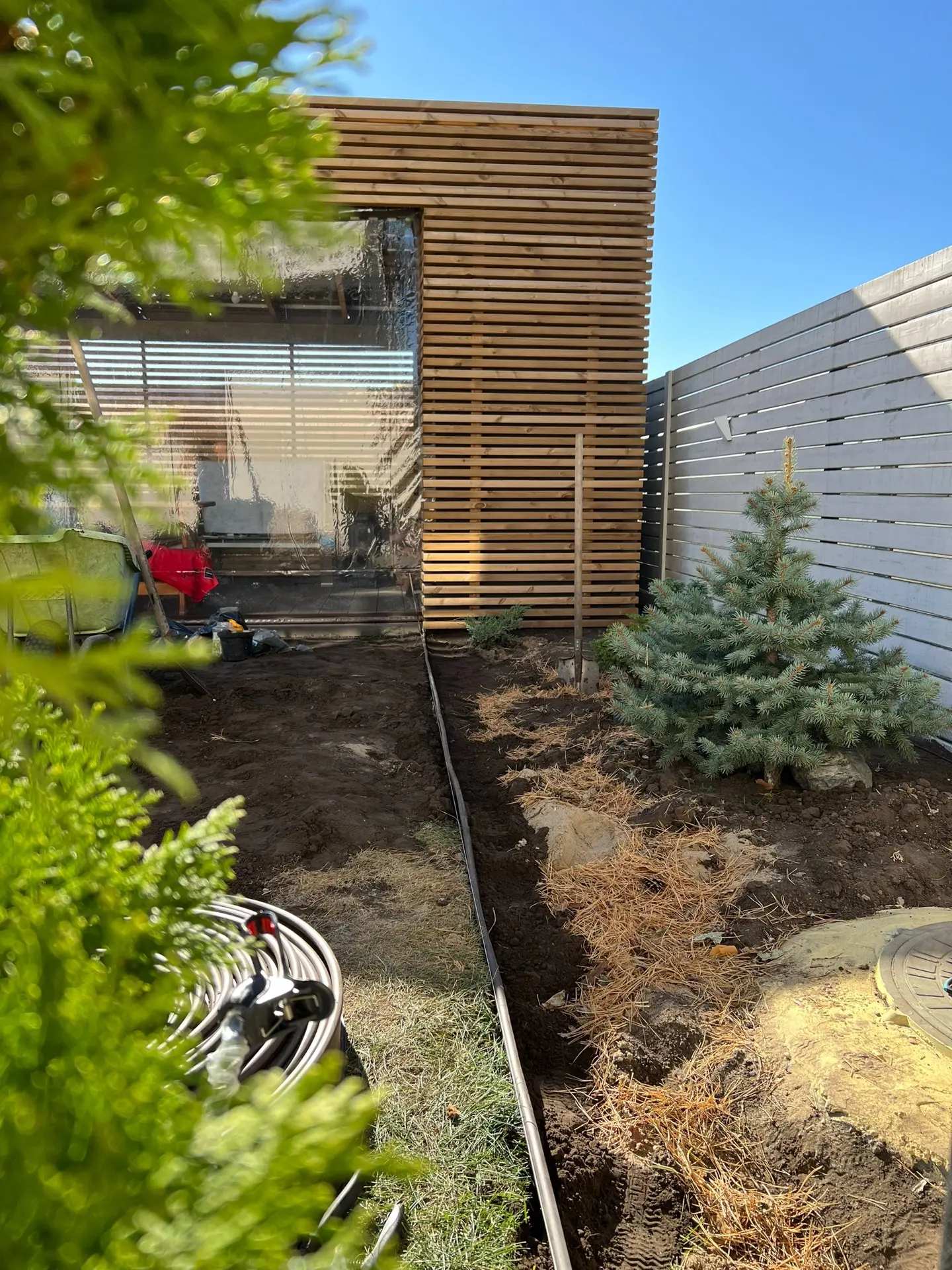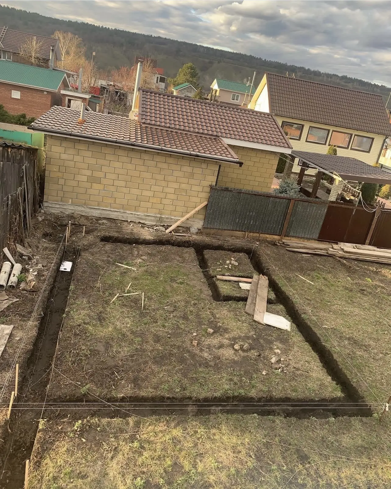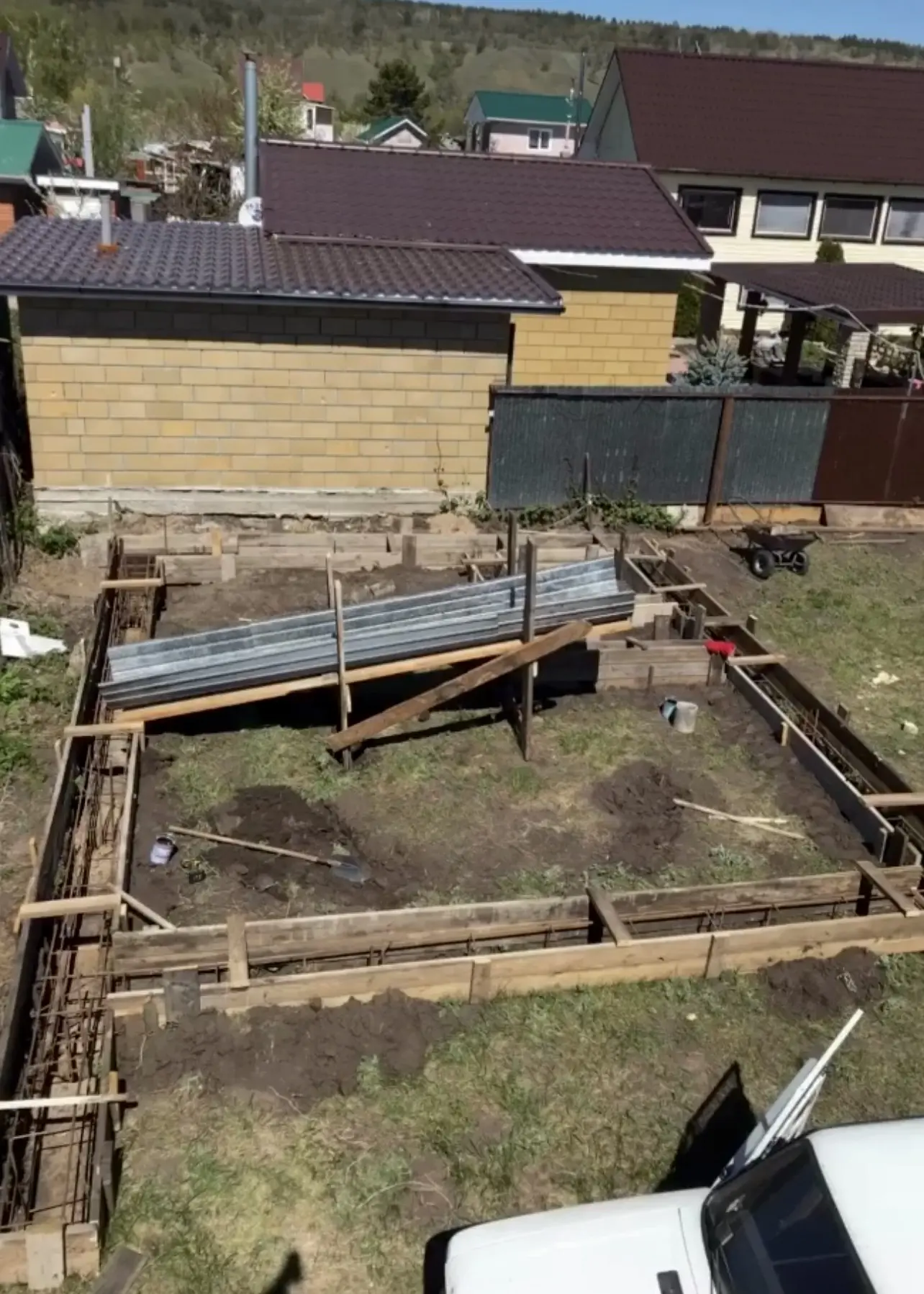 Затем сделали опалубку, армирование, усилили фундамент микросваями, заложили трубы для водопровода. После заливки фундамента освободили котлован и засыпали его речным песком.